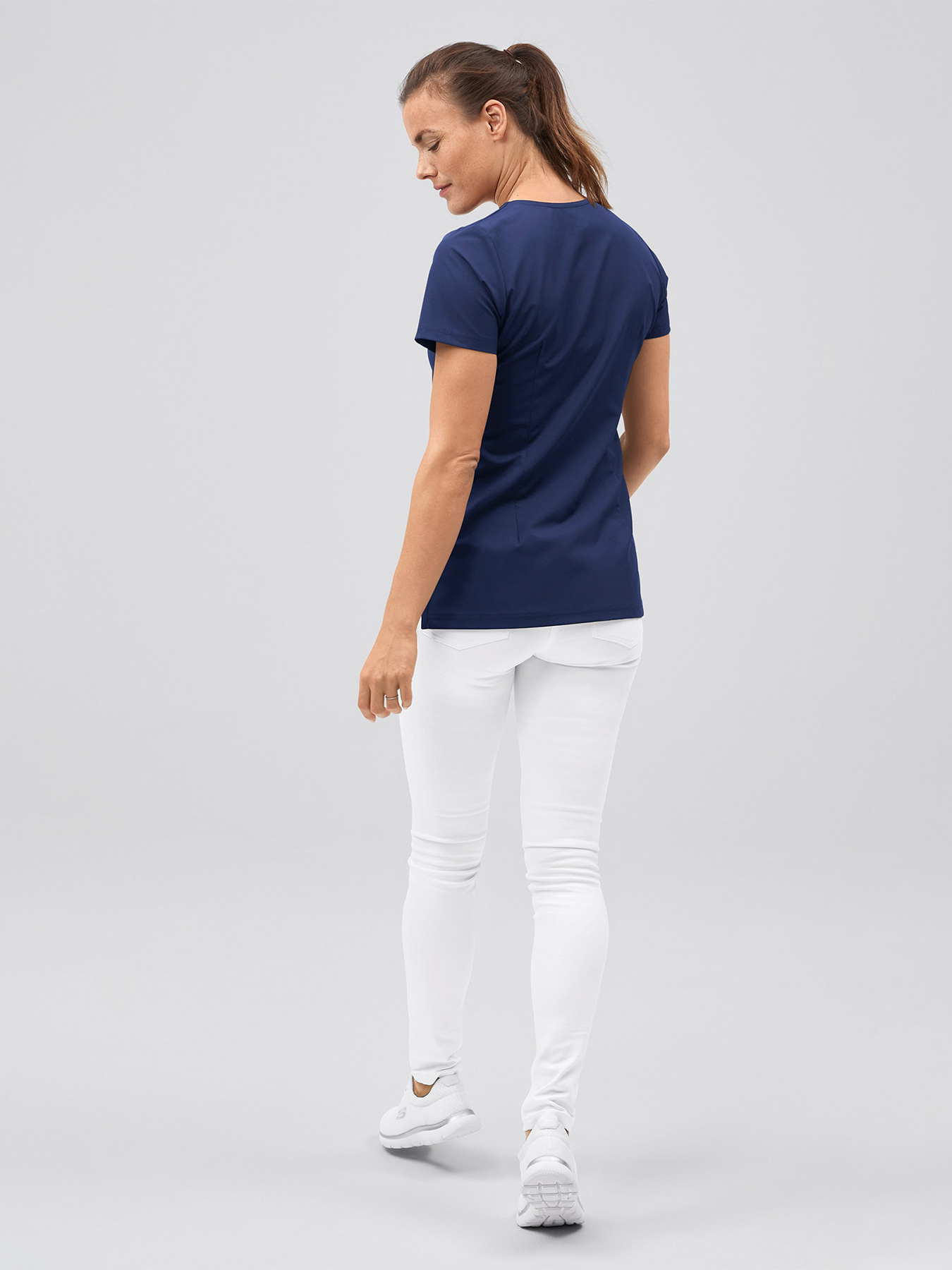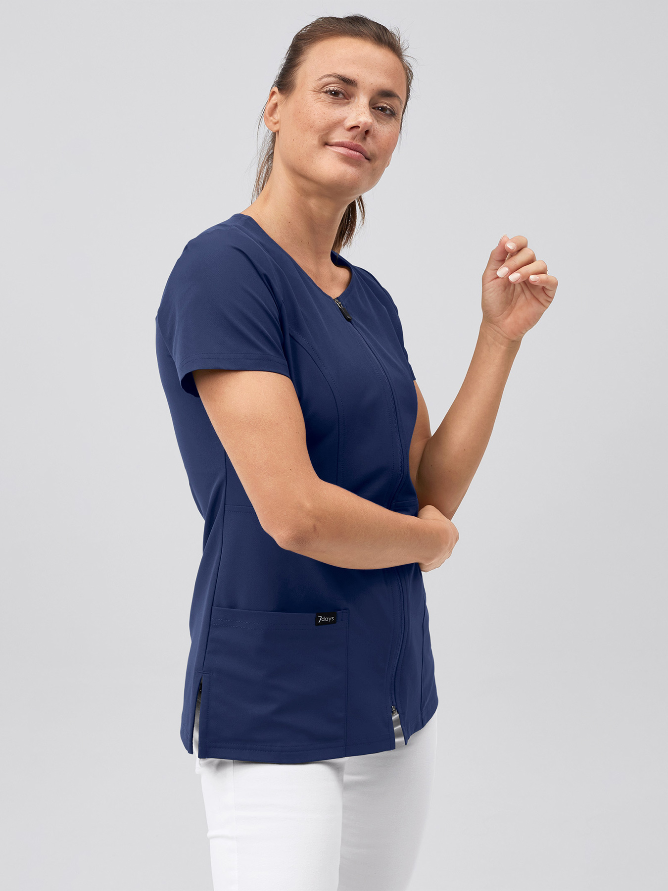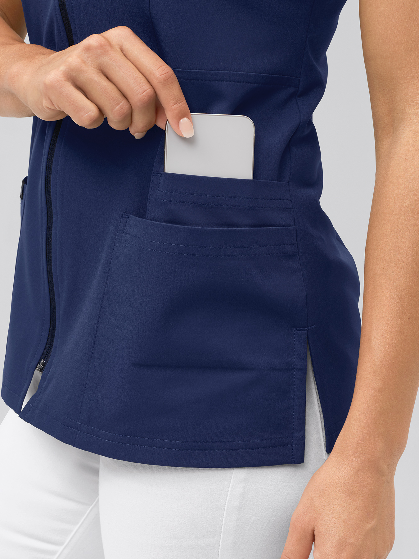 Weicher und flexibler Kasack aus feuchtigkeitsableitendem Material für ein leichtes und angenehmes Tragegefühl. Außen glänzend, innen mit wabenartiger Struktur für hohen Tragekomfort. Rundhalsausschnitt, kurzarm, Reißverschluss, zwei große, seitliche Taschen, innen mit Handyfach, Seitenschlitze. Rückenlänge Gr. S ca. 68 cm, 84% Polyester/16% Elasthan, 150 g/m², 60°-Wäsche. Die Lieferung erfolgt ohne weiteres, abgebildetes Zubehör.