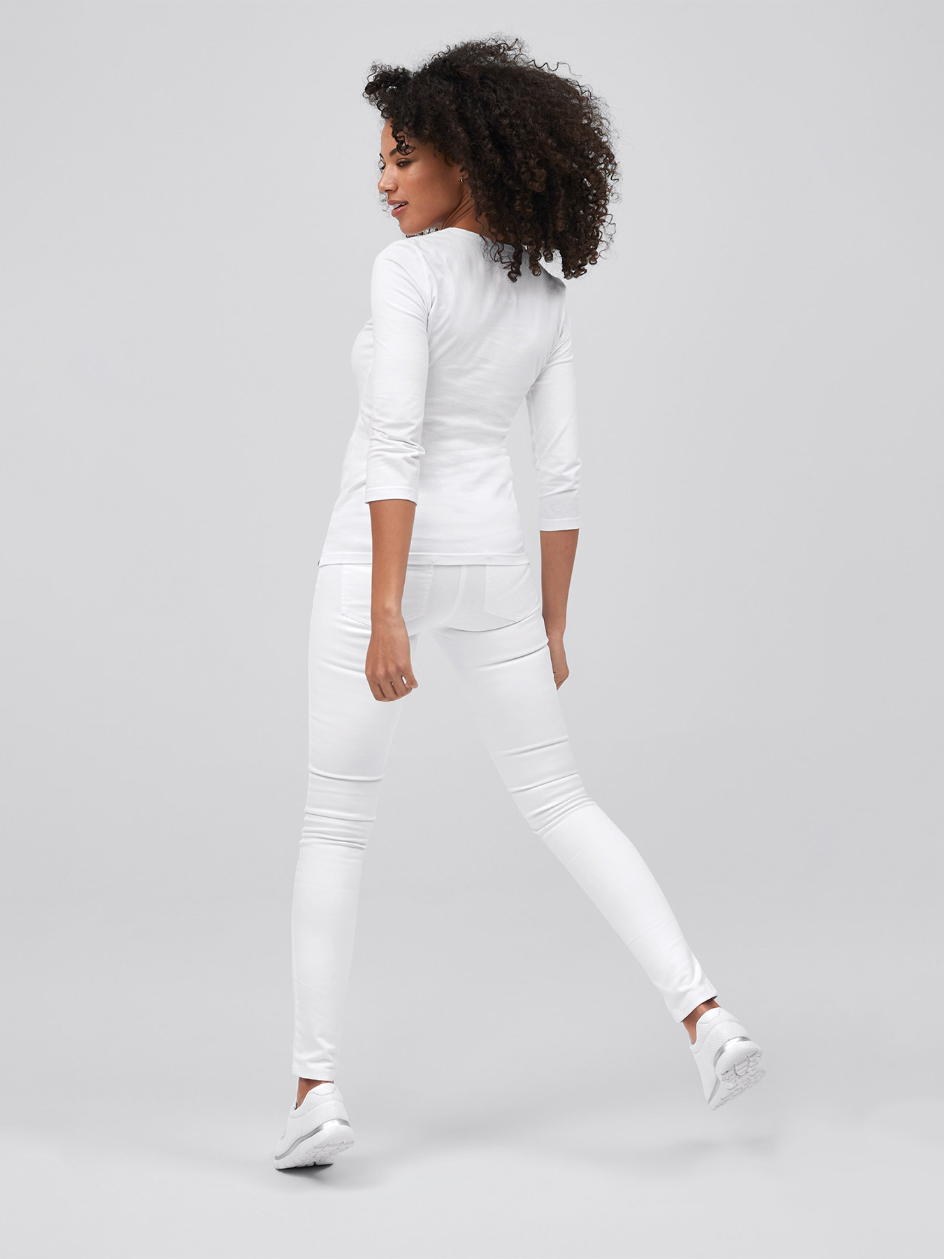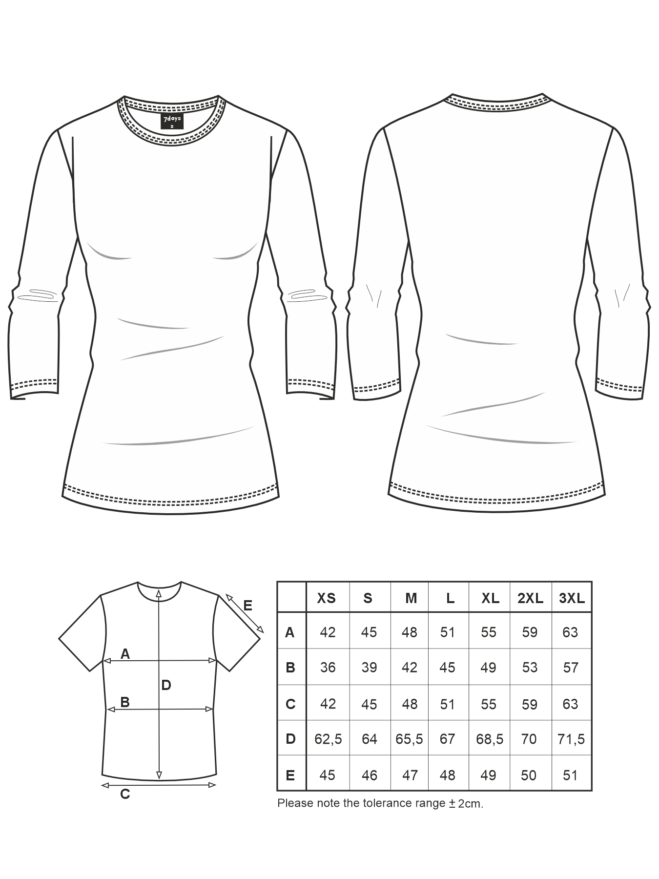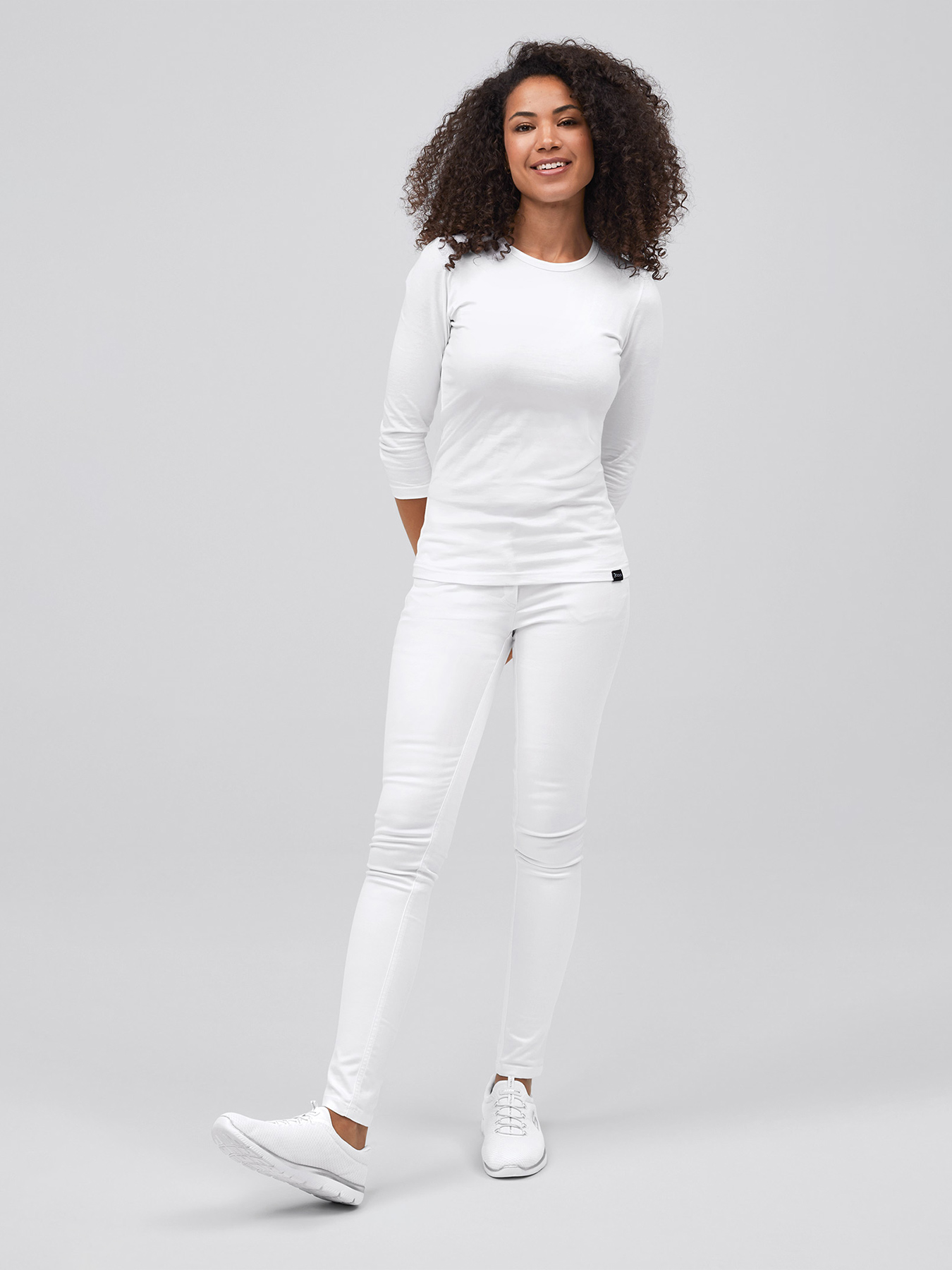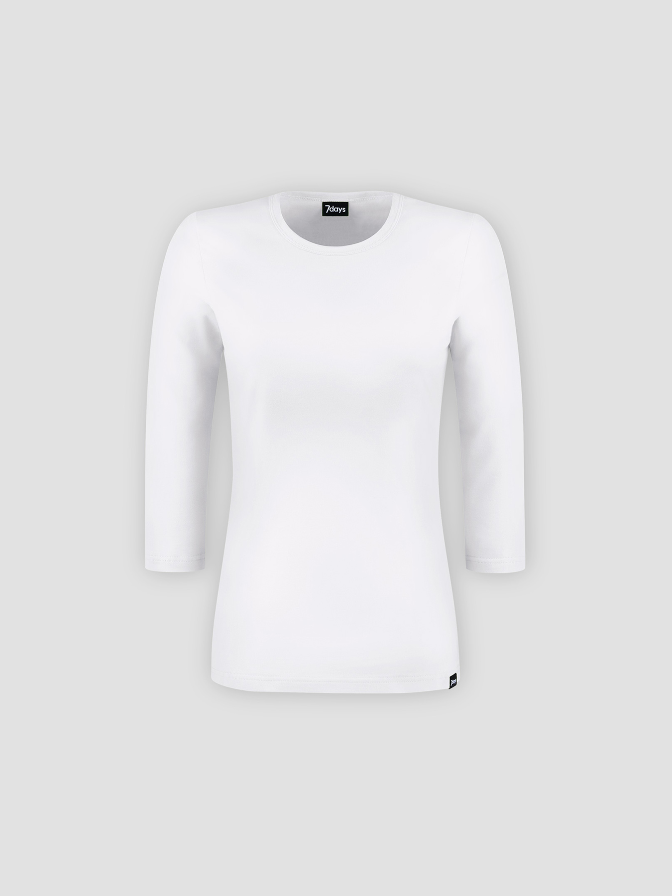 Rundhalsausschnitt, ¾-Arm, körpernah geschnitten, Rückenlänge bei Gr. S ca. 64 cm. Weiche, formstabile Qualität aus 94% Baumwolle/6% Elasthan, 200 g/m², Single Jersey, 60°-Wäsche.