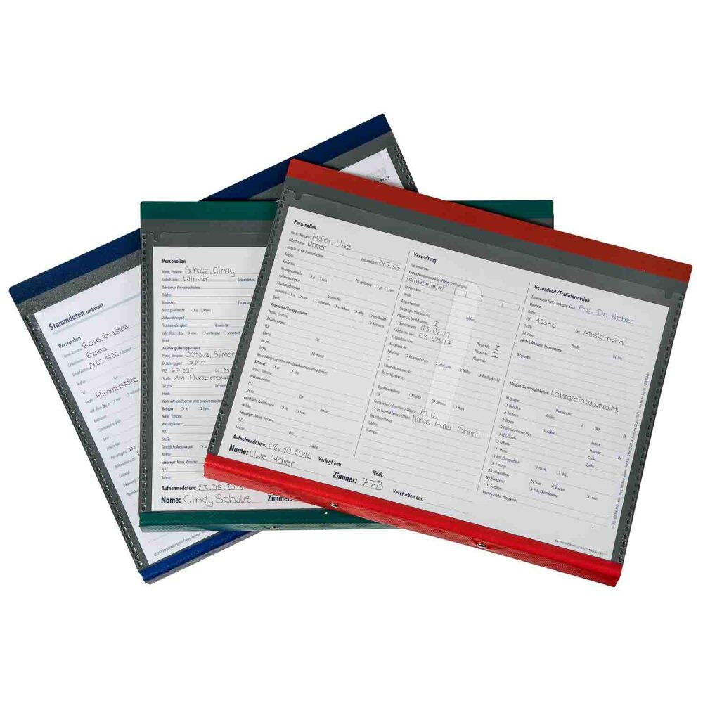 Mit dieser praktischen Ringbuchmappe haben Sie alle aktuellen Bewohnerdaten jederzeit schnell im Blick. Eine transparente Vordertasche nimmt das Stammdatenblatt mit den Patienteninformationen übersichtlich auf. Im vorderen Innendeckel befinden sich ein Klemmprofil und ein Einsteckstreifen, die wichtige Dokumente sofort zugänglich bereithalten. Eine halbhohe Klarsichttasche am Rückendeckel sorgt für eine einfache Ablage und Entnahme von Unterlagen. Die Mappe ist wahlweise mit einer 2-Ring- oder einer 4-Ring-Mechanik erhältlich.