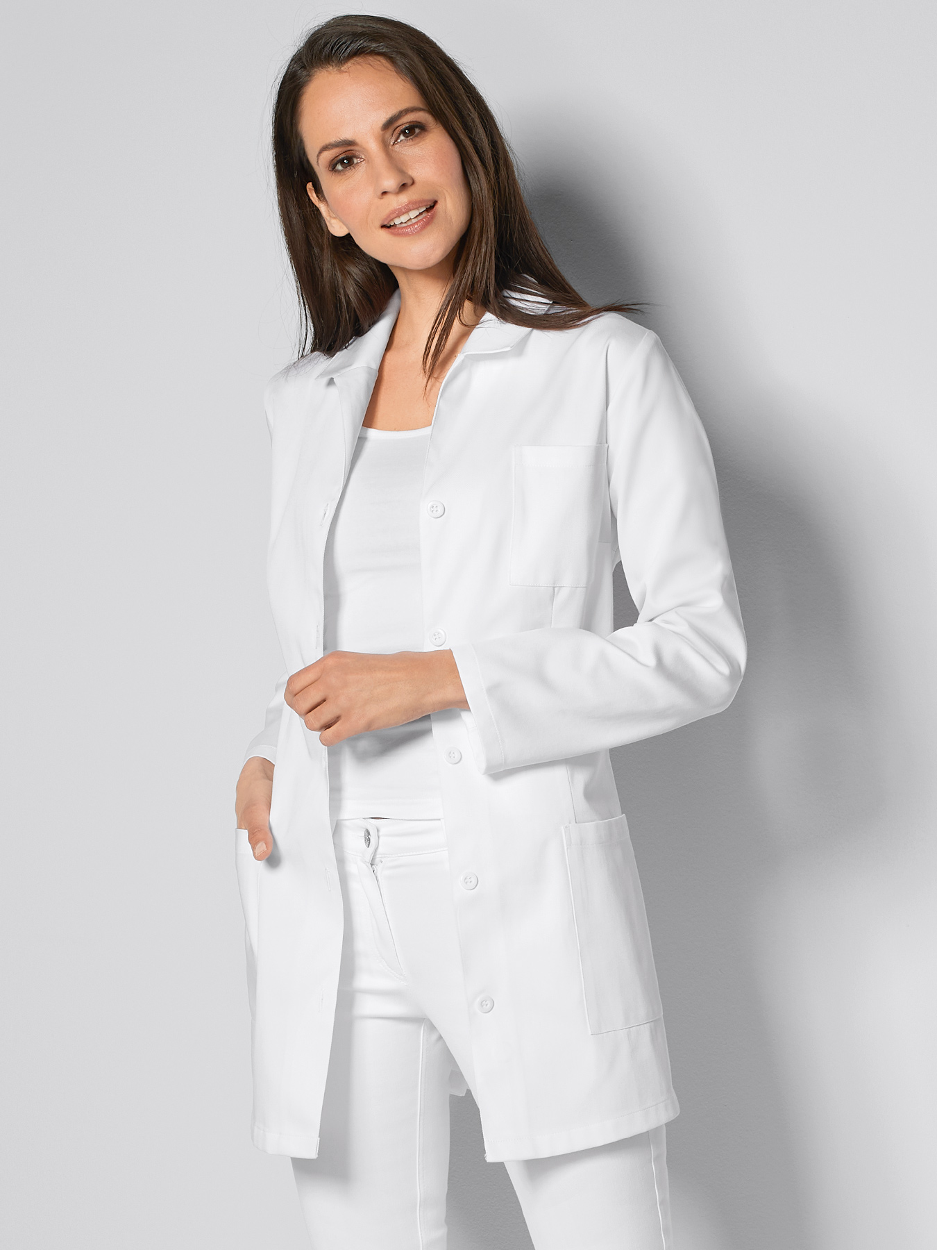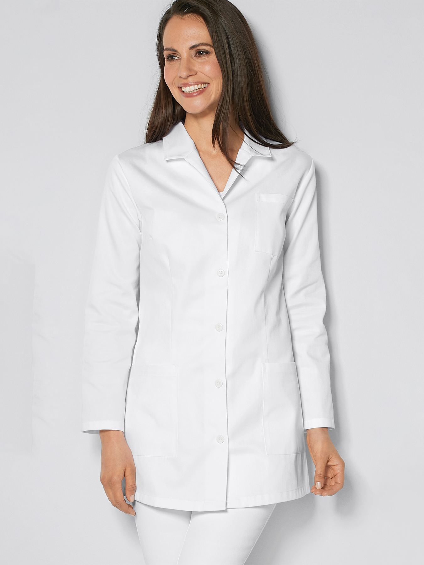 Reverskragen, Knopfleiste, 2 große Eingrifftaschen, 1 kleine Brusttasche, figurbetonende Abnäher vorne und hinten, Brustabnäher, Rückenlänge ca. 77 cm. 100% Baumwolle, 95°-Wäsche, 210 g/m2.