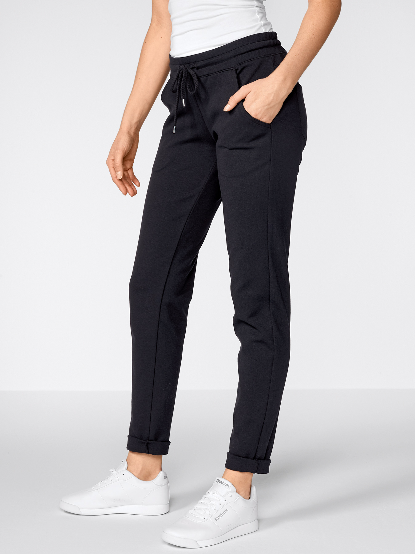 Lässige, bügelleichte und knitterarme "Wohlfühlhose" mit Gummibund und Kordeltunnelzug, etwas niedrigere Leibhöhe, lässig geschnittenes Bein mit etwas schmaler werdender Fußweite, 2 seitliche Taschen vorne, 2 Gesäßtaschen. 65% Baumwolle/30% Polyester/5% Elasthan, außer grau melange = 70% Polyester/25% Baumwolle/5% Elasthan, Interlock-Jerseyware, 60°-Wäsche.