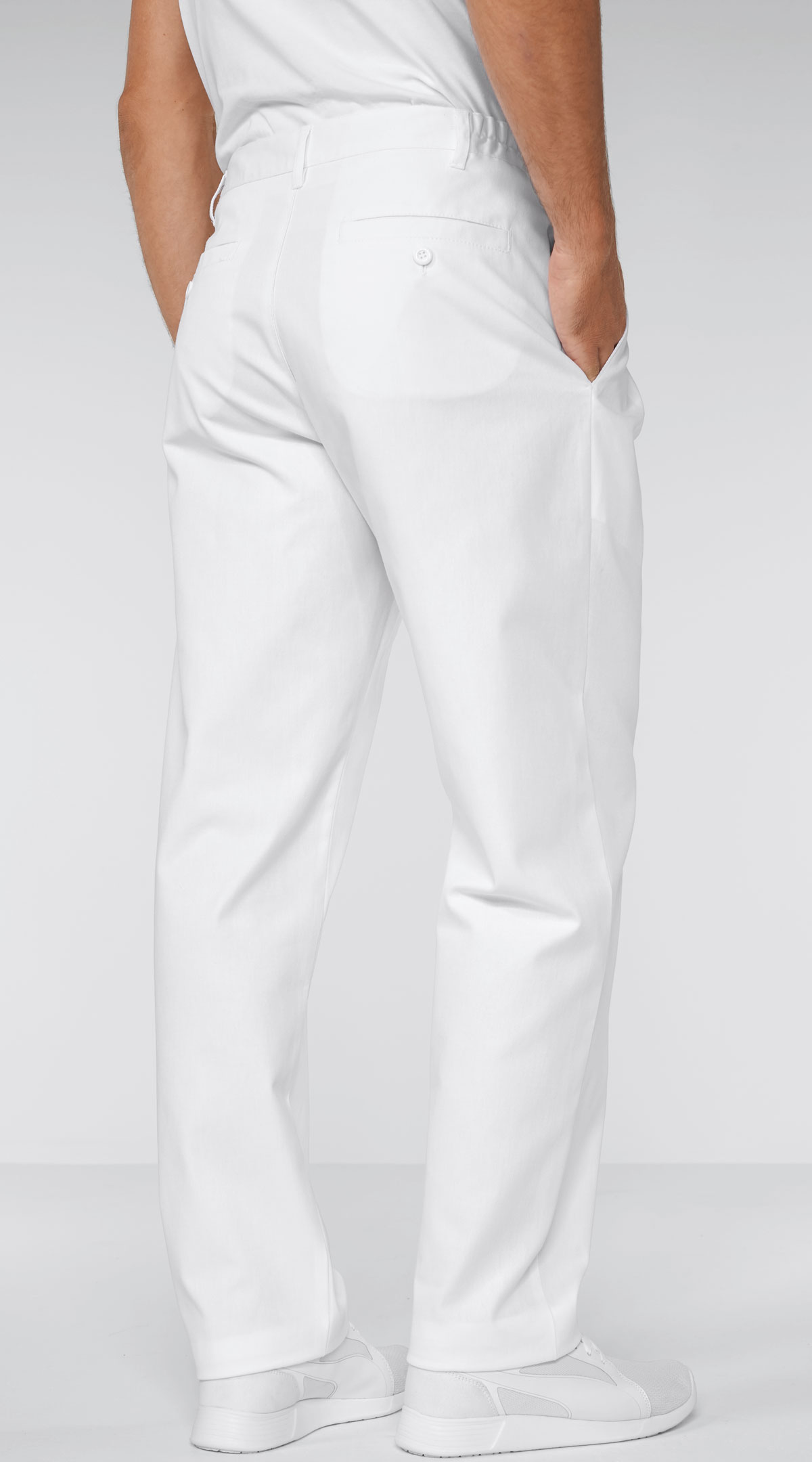 Diese legere Apotheker-, Labor- oder Arzthose besteht aus 100% Baumwolle. Dies erhöht den Tragekomfort und gleichzeitig das Wohlbefinden bei der Arbeit. Die schlichte Hose ist für Herren und hat einen geraden Bund mit Gummieinsatz und hohe Leibhöhe. Die Beinform ist ebenfalls gerade gehalten, dies verleiht ihr ein ordentliches und professionelles Aussehen. Diese praktische Hose besitzt 2 Gesäß- und 2 Seitentaschen. Dort finden nützliche Arbeitsutensilien ihren Platz und sind stets griffbereit. Die Baumwollhose ist sehr strapazierfähig und robust.