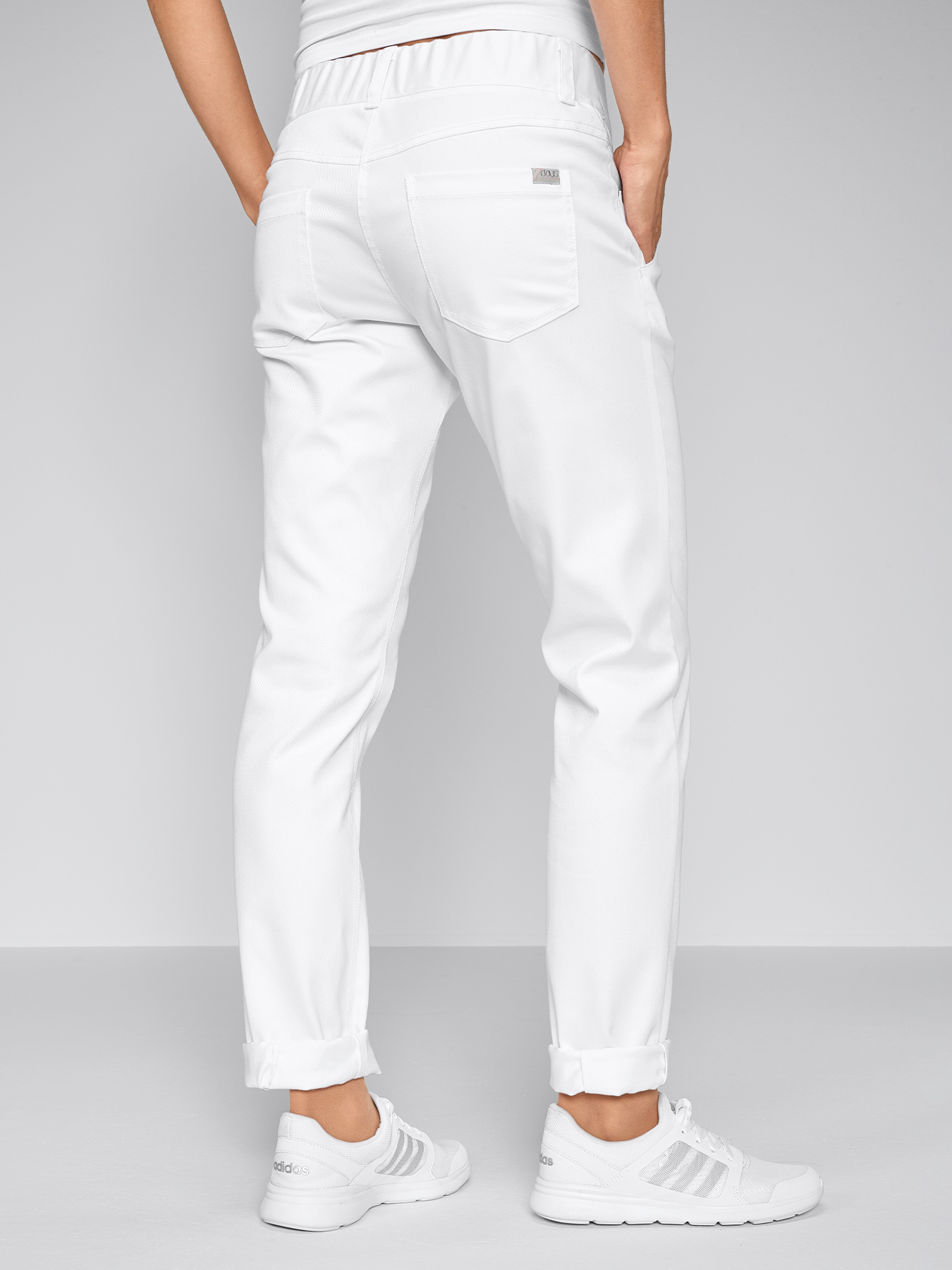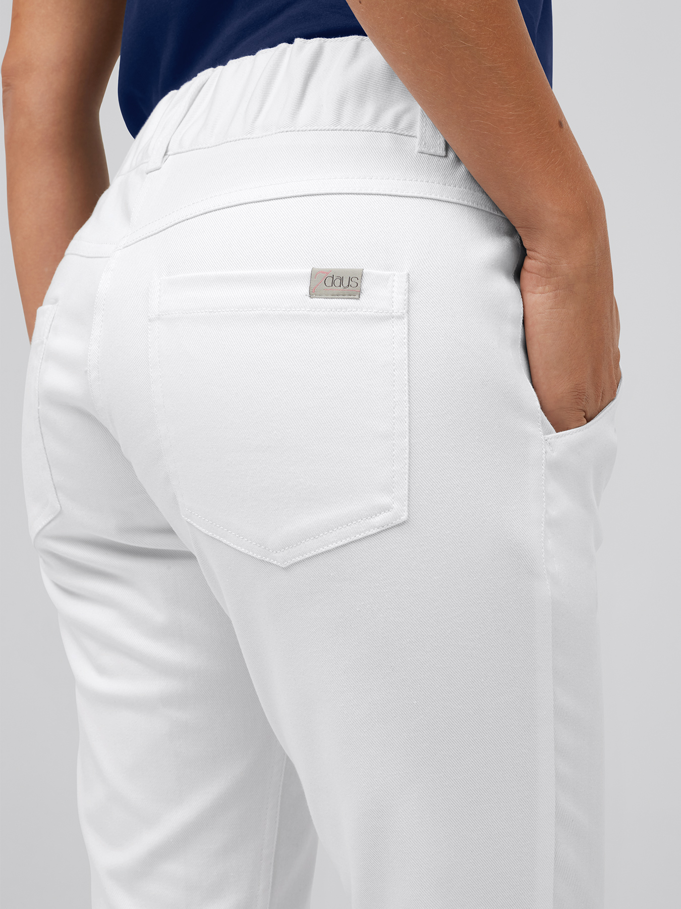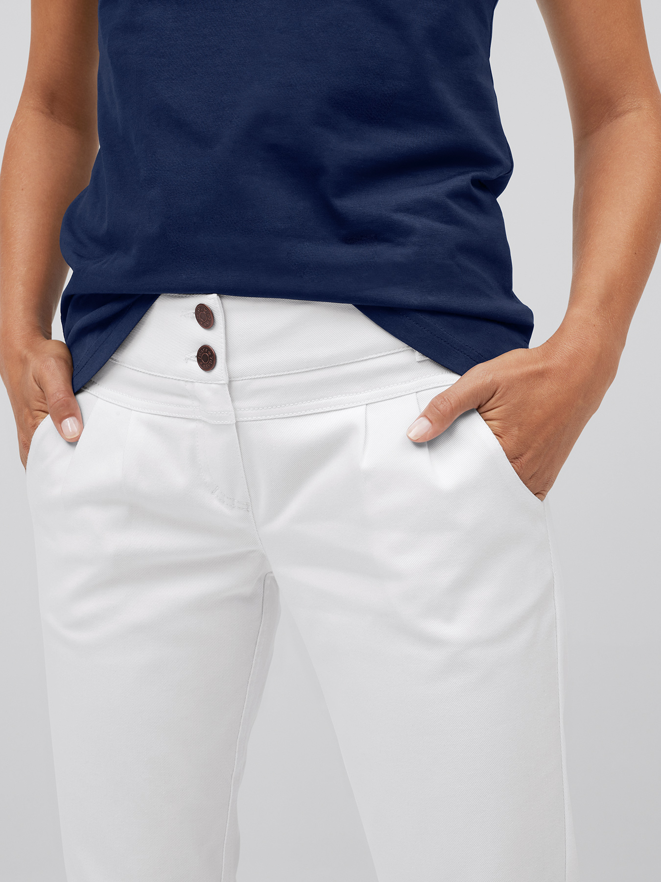 Breiter Komfortbund mit Gummieinsatz im hinteren Bund, Gürtelschlaufen, Bundfalten vorne, etwas niedrigere Leibhöhe, 5-Pocket mit seitlichen Einschubtaschen vorne, Passennaht hinten, bequeme Weite mit enger werdender Fußweite. Knitterarme und bügelleichte Qualität aus 64% Baumwolle/35% Polyester/1% Elasthan, 300 g/m2, Stretchware, 60°-Wäsche.
