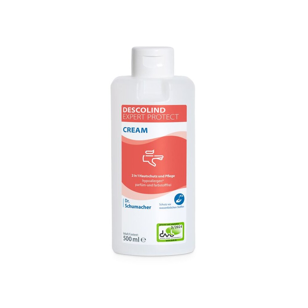DESCOLIND EXPERT PROTECT CREAM wurde speziell zum Schutz empfindlicher und zu Allergien neigenden Hände im Arbeitsalltag entwickelt. Die Öl-in-Wasser Hautschutzcreme lässt sich hervorragend verteilen, zieht schnell in die Haut ein. DESCOLIND EXPERT PROTECT CREAM hinterlässt ein glattes sowie gepflegtes Gefühl. DESCOLIND EXPERT PROTECT CREAM eignet sich zur täglichen Anwendung vor hautbelastenden Tätigkeiten, um die Haut der Hände bei Feuchtarbeiten zu schützen. Aufgrund eines natürlichen Deokomplexes mit Hamamelis, und ohne Aluminiumsalze, empfiehlt sich die Anwendung der DESCOLIND EXPERT PROTECT CREAM insbesondere zum Schutz der Hände bei längeren Handschuh-Tragezeiten. Die Schutzwirkung von DESCOLIND EXPERT PROTECT CREAM gegenüber wasserlöslichen Stoffen (Tensiden und Laugen) wurde nach neuesten Prüfmethoden im Probandenversuch nachgewiesen. Durch den zusätzlichen Verzicht auf Parfüm entspricht DESCOLIND EXPERT PROTECT CREAM den Anforderungen der Berufsgenossenschaft, der TRGS 401 sowie der AWMF-Leitlinie Händehygiene. Sie ist auch zur Anwendung in Wandspendern geeignet. Für eine hygienisch sichere Anwendung des Produktes im Wandspender wurde der DESCOLIND EXPERT PROTECT CREAM ein geringer Anteil eines gut verträglichen Konservierungsmittels zugesetzt. Neben seiner Schutzwirkung verfügt DESCOLIND EXPERT PROTECT CREAM auch über pflegende Eigenschaften und beinhaltet hierfür rückfettende Lipide sowie Glycerin.