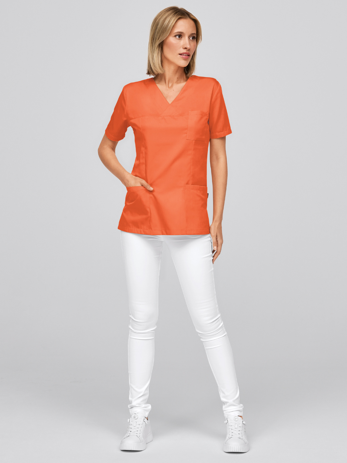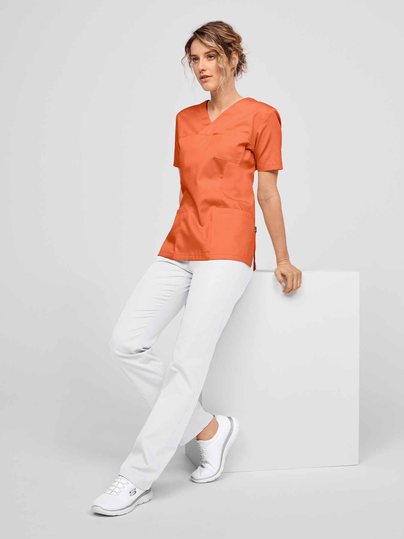 • Komfortabler Sitz mit femininer Passform: Leicht überschnittener V-Ausschnitt für bequemes An- und Ausziehen, figurbetonende Abnäher vorne und hinten sorgen für eine optimale Passform. Seitenschlitze ermöglichen Flexibilität und Komfort im Arbeitsalltag. Rückenlänge bei Gr. S ca. 66 cm.