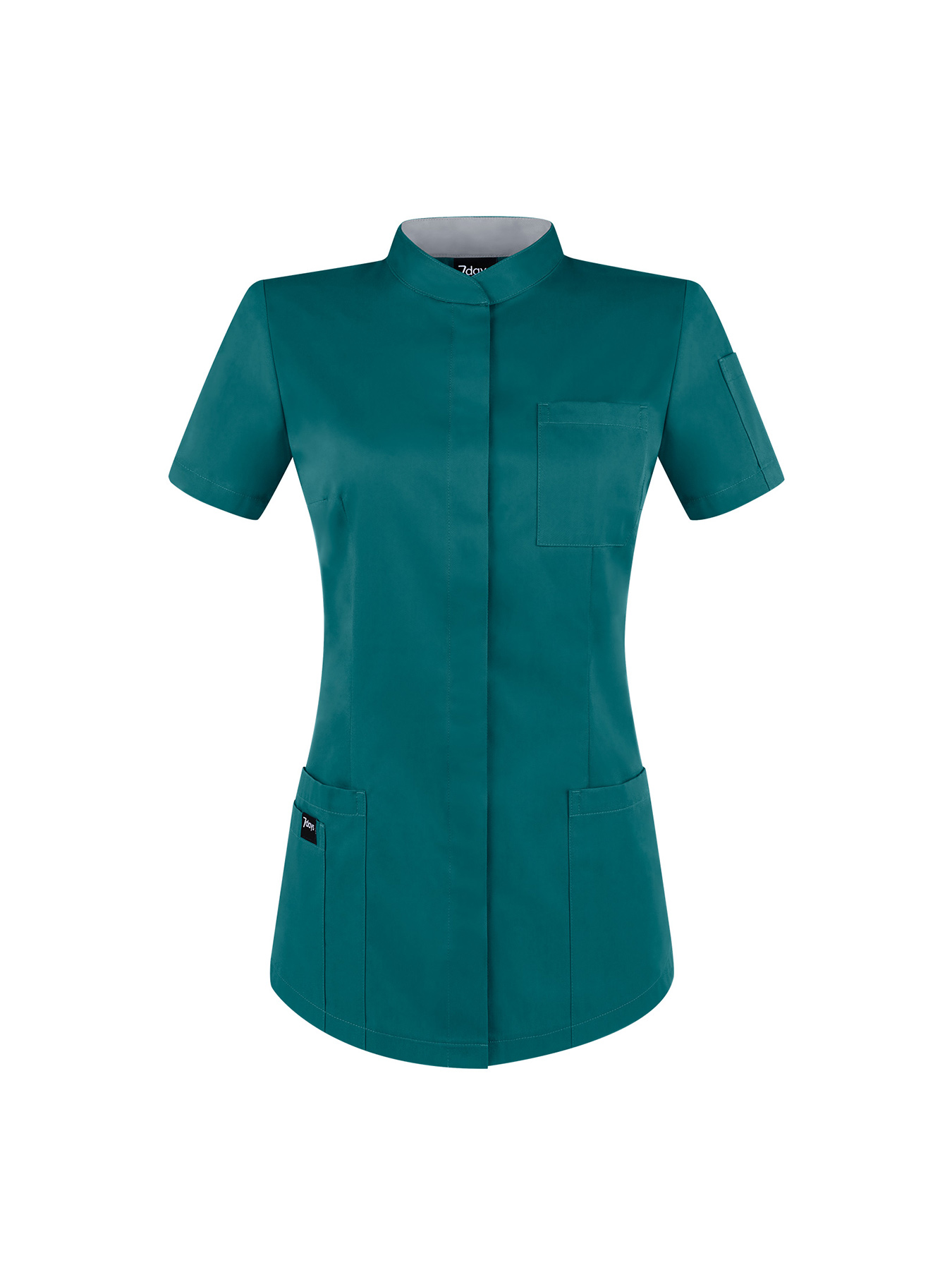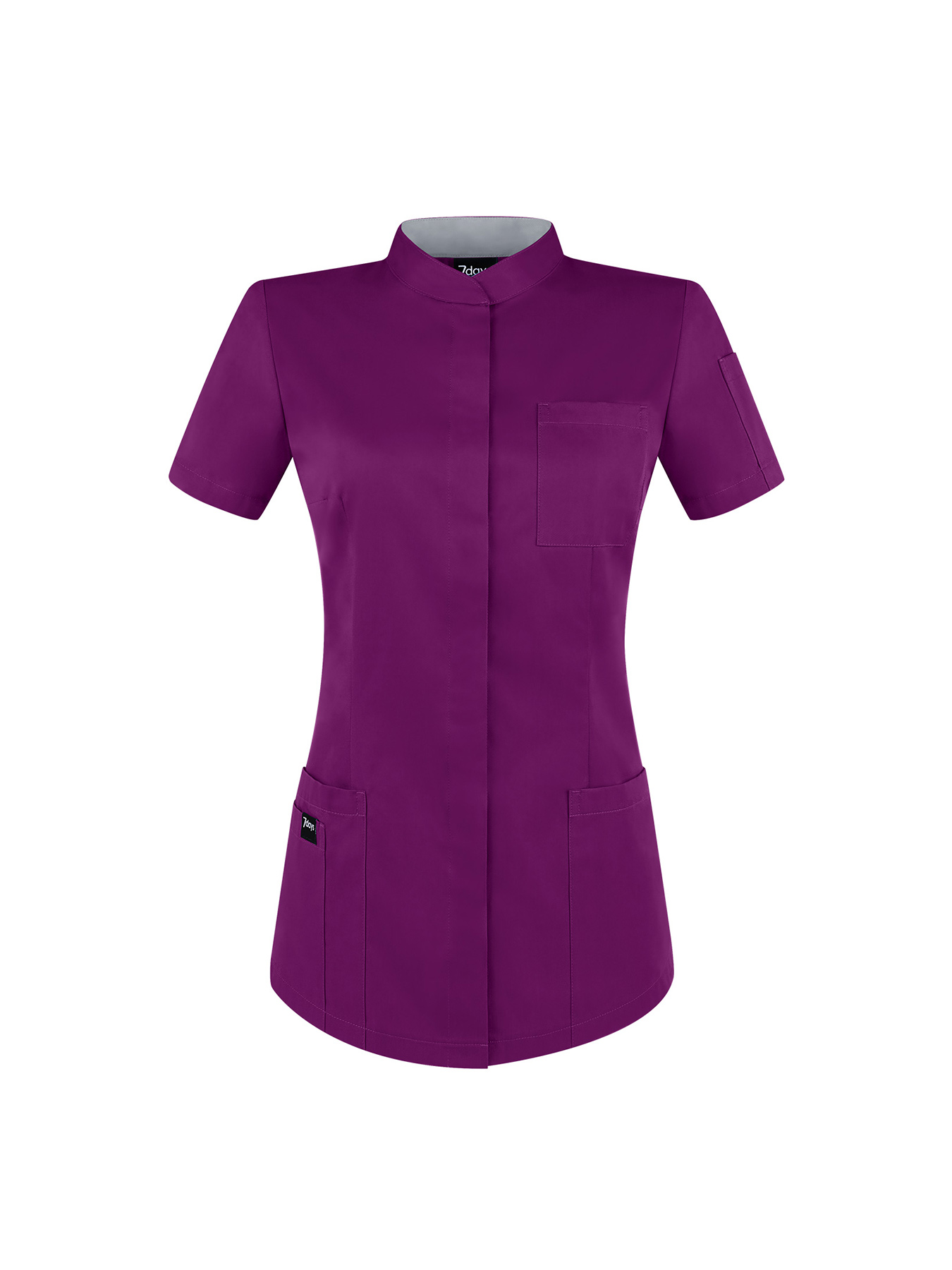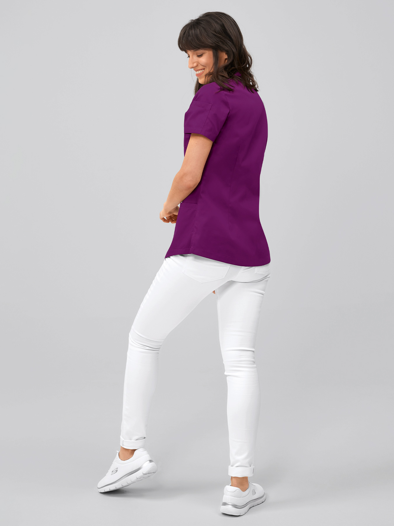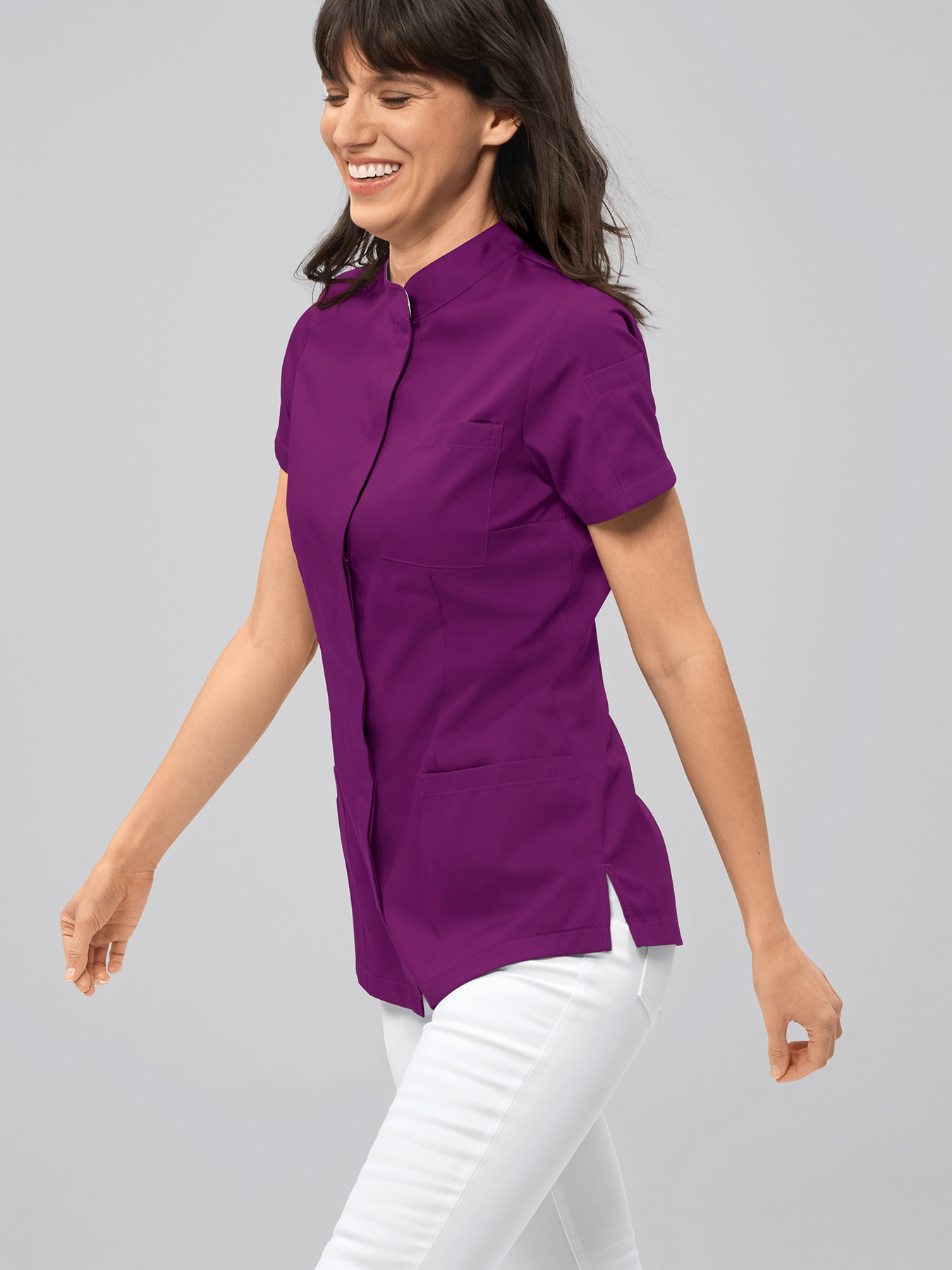 Sportlicher Damenkasack mit verdeckter Druckknopfleiste. Stehkragen mit kontrastfarbener Innenseite, 1 Brusttasche, 2 große Einschubtaschen, 1 kleine Einschubtasche, 1 kleine Tasche am Ärmel. Figurbetonende Abnäher, bequeme Seitenschlitze, Rückenlänge Gr. S ca. 68 cm. Farben = 50% Baumwolle/50% Polyester, 150 g/m2, weiß = 65% Polyester/35% Baumwolle, 195 g/m2, 95°-Wäsche, trocknergeeignet. Die Lieferung erfolgt ohne Kugelschreiber.