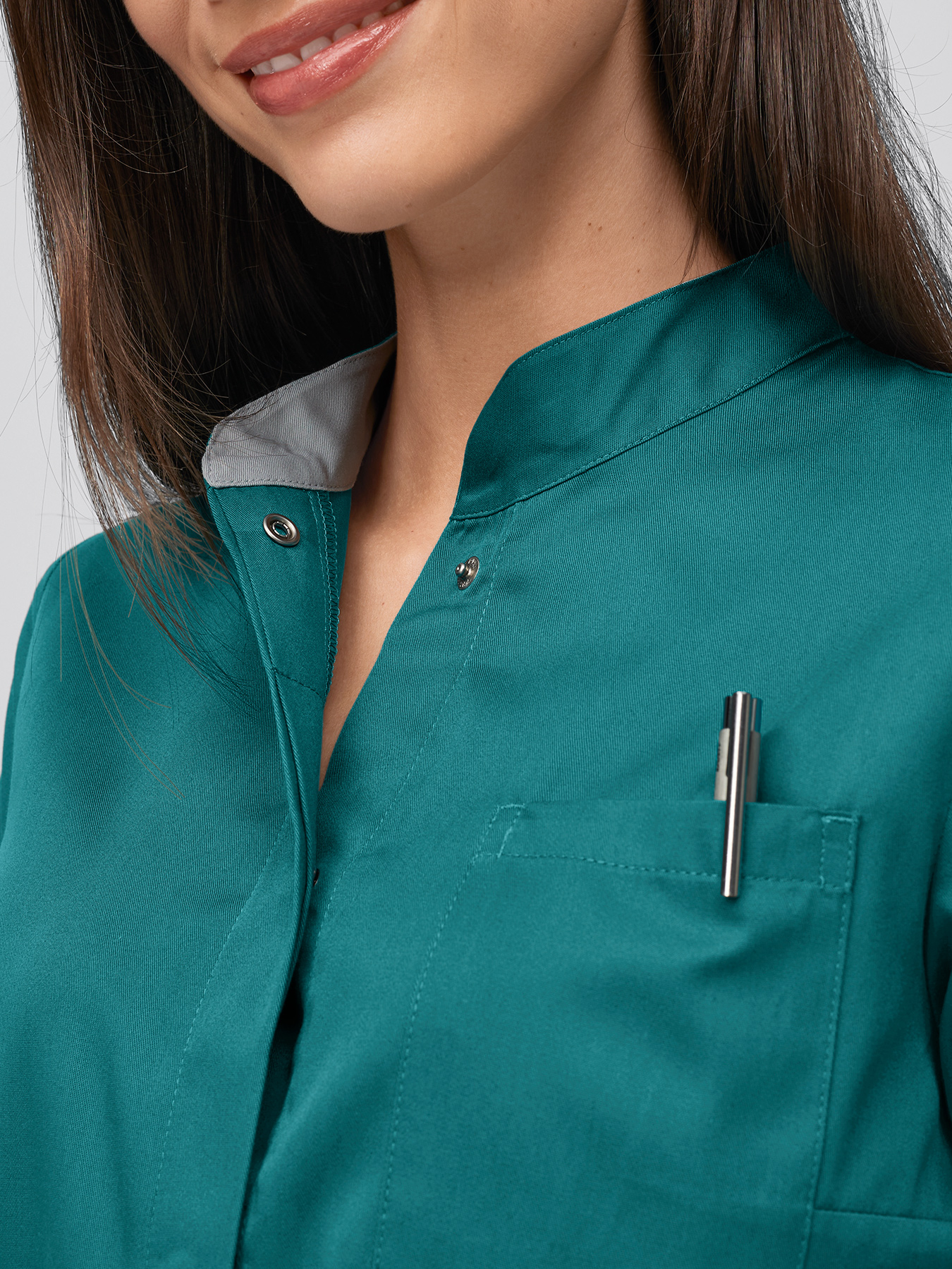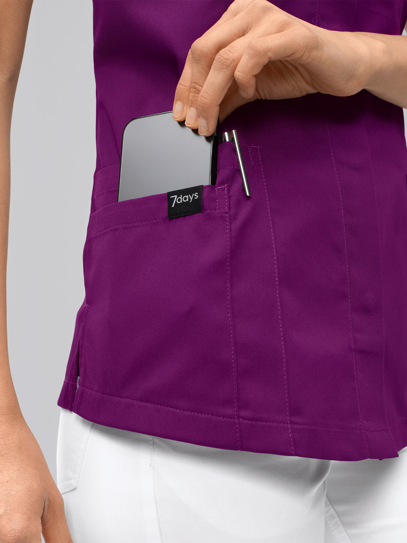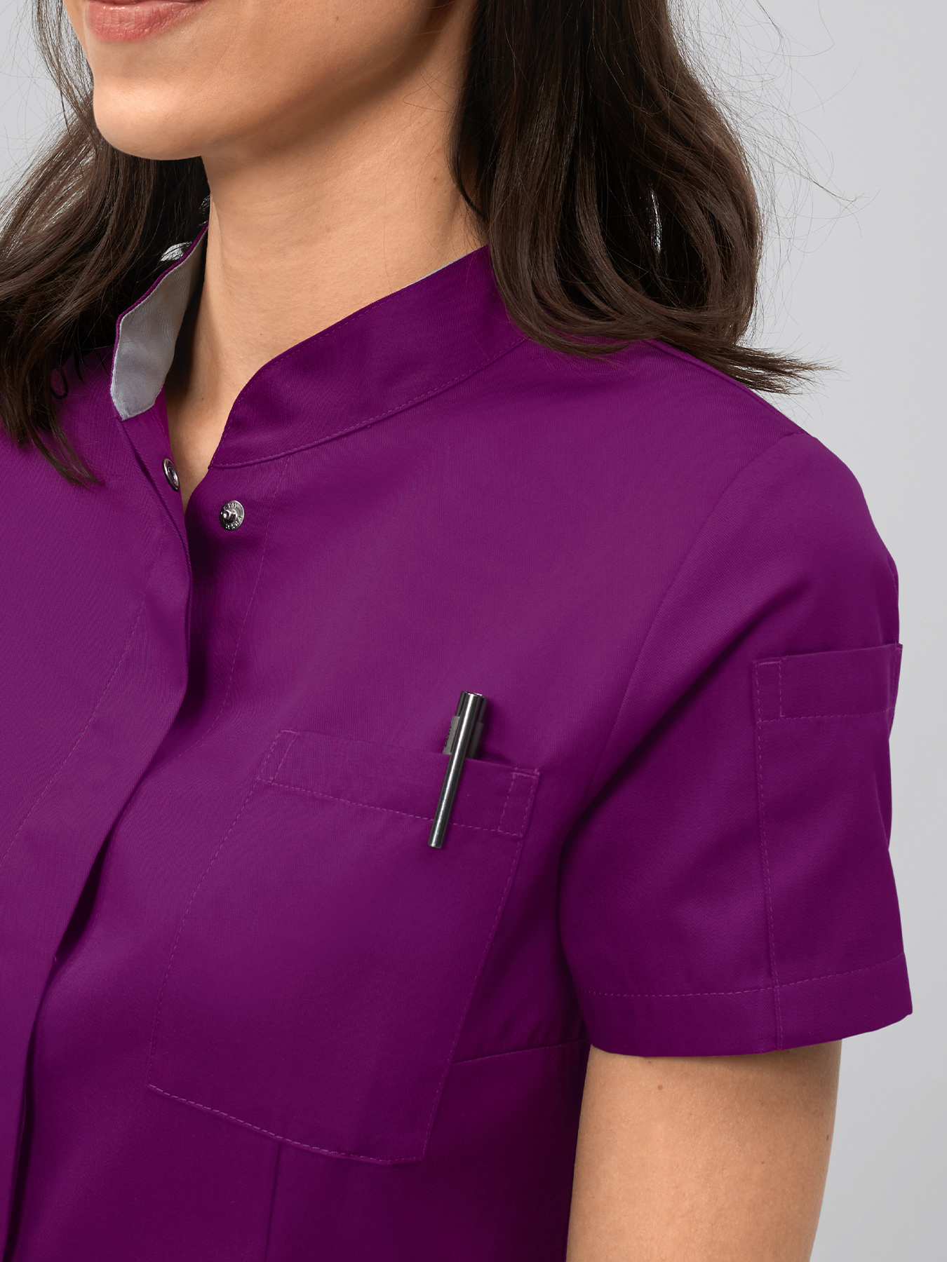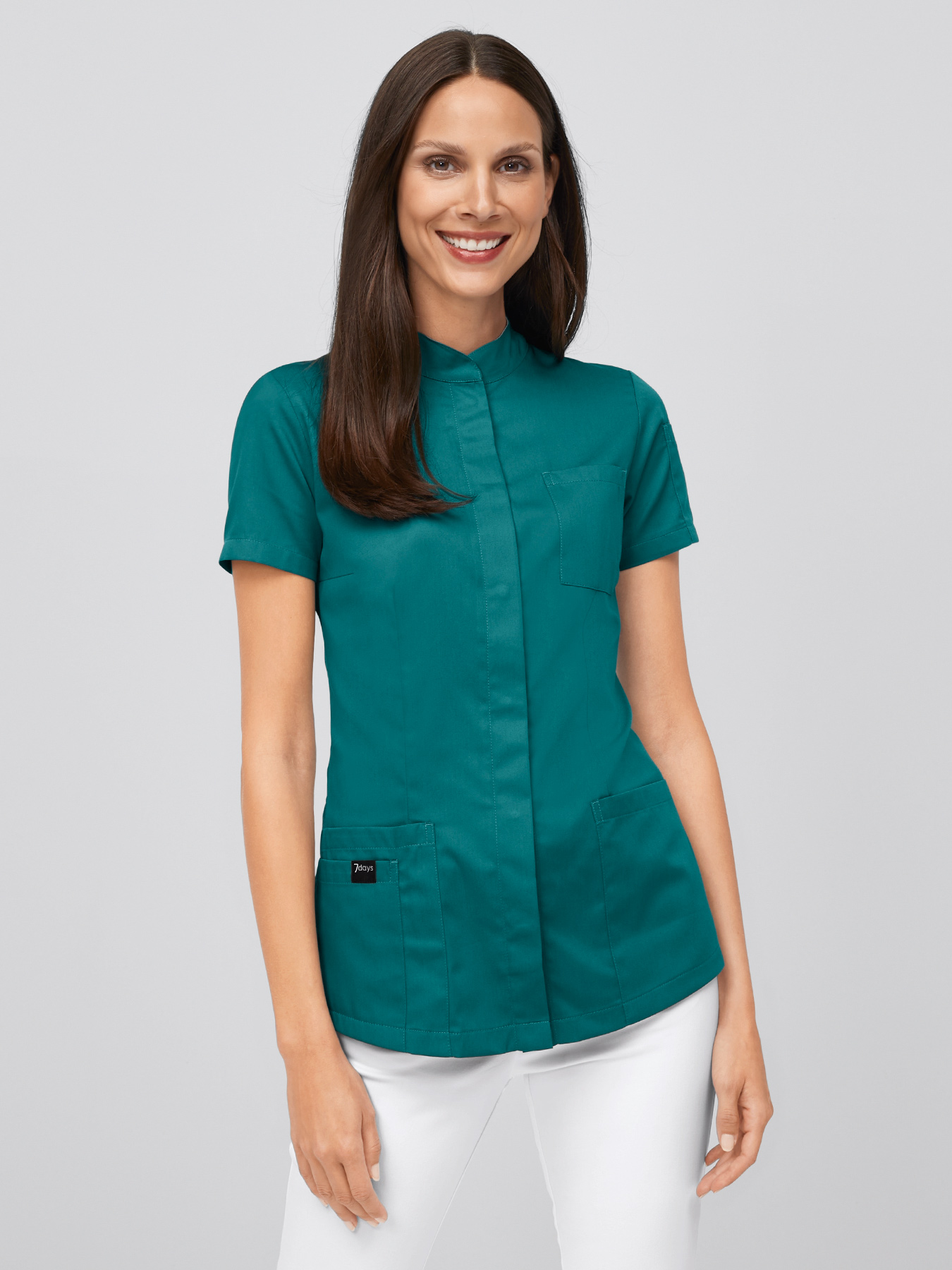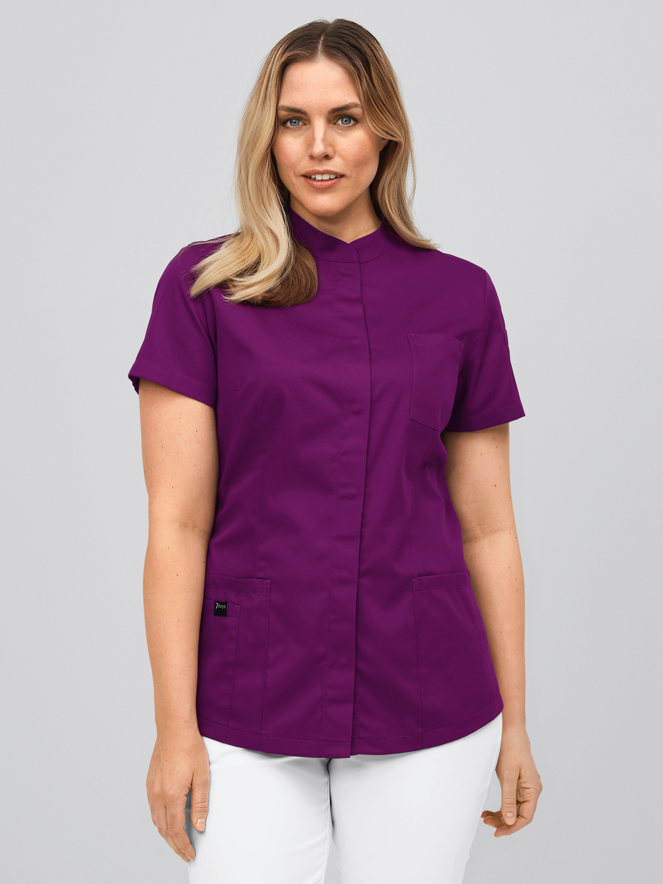 Sportlicher Damenkasack mit verdeckter Druckknopfleiste. Stehkragen mit kontrastfarbener Innenseite, 1 Brusttasche, 2 große Einschubtaschen, 1 kleine Einschubtasche, 1 kleine Tasche am Ärmel. Figurbetonende Abnäher, bequeme Seitenschlitze, Rückenlänge Gr. S ca. 68 cm. Farben = 50% Baumwolle/50% Polyester, 150 g/m2, weiß = 65% Polyester/35% Baumwolle, 195 g/m2, 95°-Wäsche, trocknergeeignet. Die Lieferung erfolgt ohne Kugelschreiber.