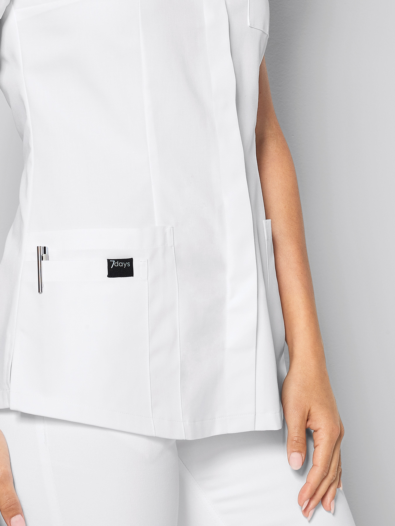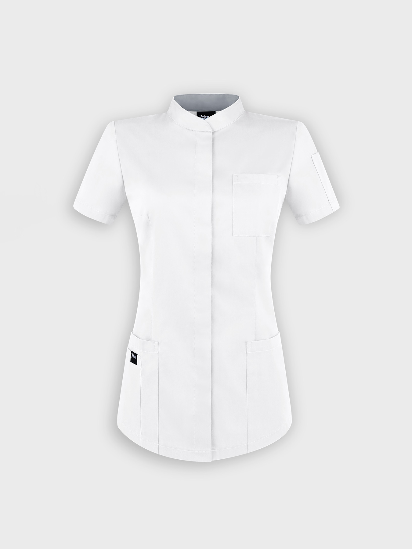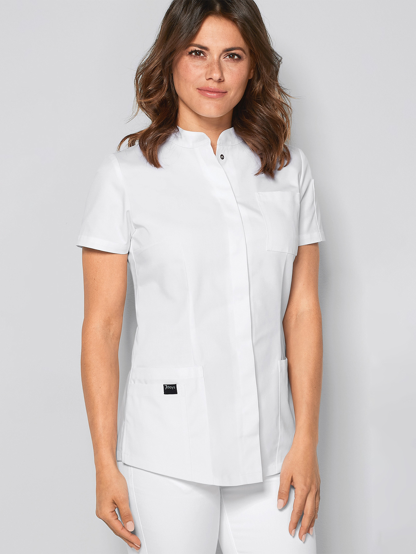 Sportlicher Damenkasack mit verdeckter Druckknopfleiste. Stehkragen mit kontrastfarbener Innenseite, 1 Brusttasche, 2 große Einschubtaschen, 1 kleine Einschubtasche, 1 kleine Tasche am Ärmel. Figurbetonende Abnäher, bequeme Seitenschlitze, Rückenlänge Gr. S ca. 68 cm. Farben = 50% Baumwolle/50% Polyester, 150 g/m2, weiß = 65% Polyester/35% Baumwolle, 195 g/m2, 95°-Wäsche, trocknergeeignet. Die Lieferung erfolgt ohne Kugelschreiber.