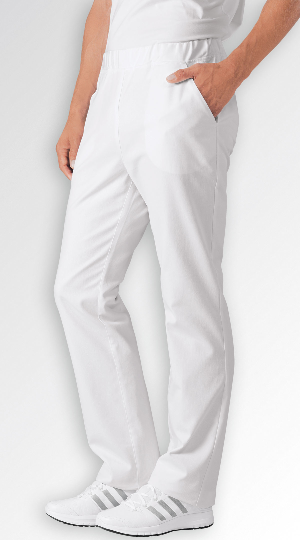Bequeme Schlupfhose mit Rundumgummibund, 2 Taschen vorne, 1 Gesäßtasche, hohe Leibhöhe, gerade geschnittenes Bein mit bequemer Beinweite. 100% Baumwolle, 95° waschbar und chlorbar, 240 g/m².