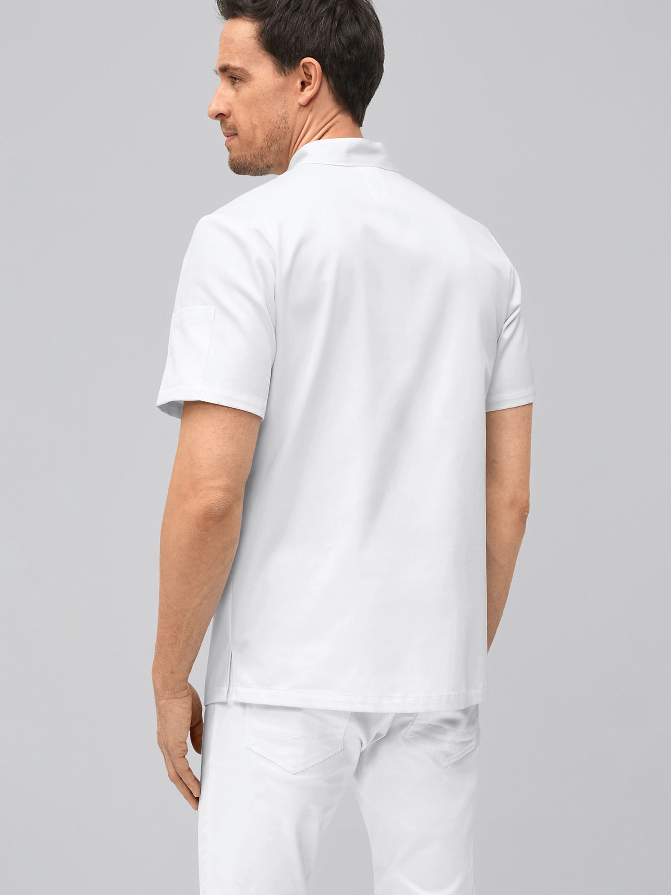 Sportlicher Herrenkasack mit verdeckter Druckknopfleiste. Modern fit, Stehkragen mit kontrastfarbener Innenseite, 1 Brusttasche mit abgetrennter Kulitasche, 2 große Einschubtaschen, 1 kleine Tasche am Ärmel. Bequeme Seitenschlitze, Rückenlänge Gr. M ca. 74 cm. 100 % Baumwolle, 95°-Wäsche, chlorbar, trocknergeeignet.