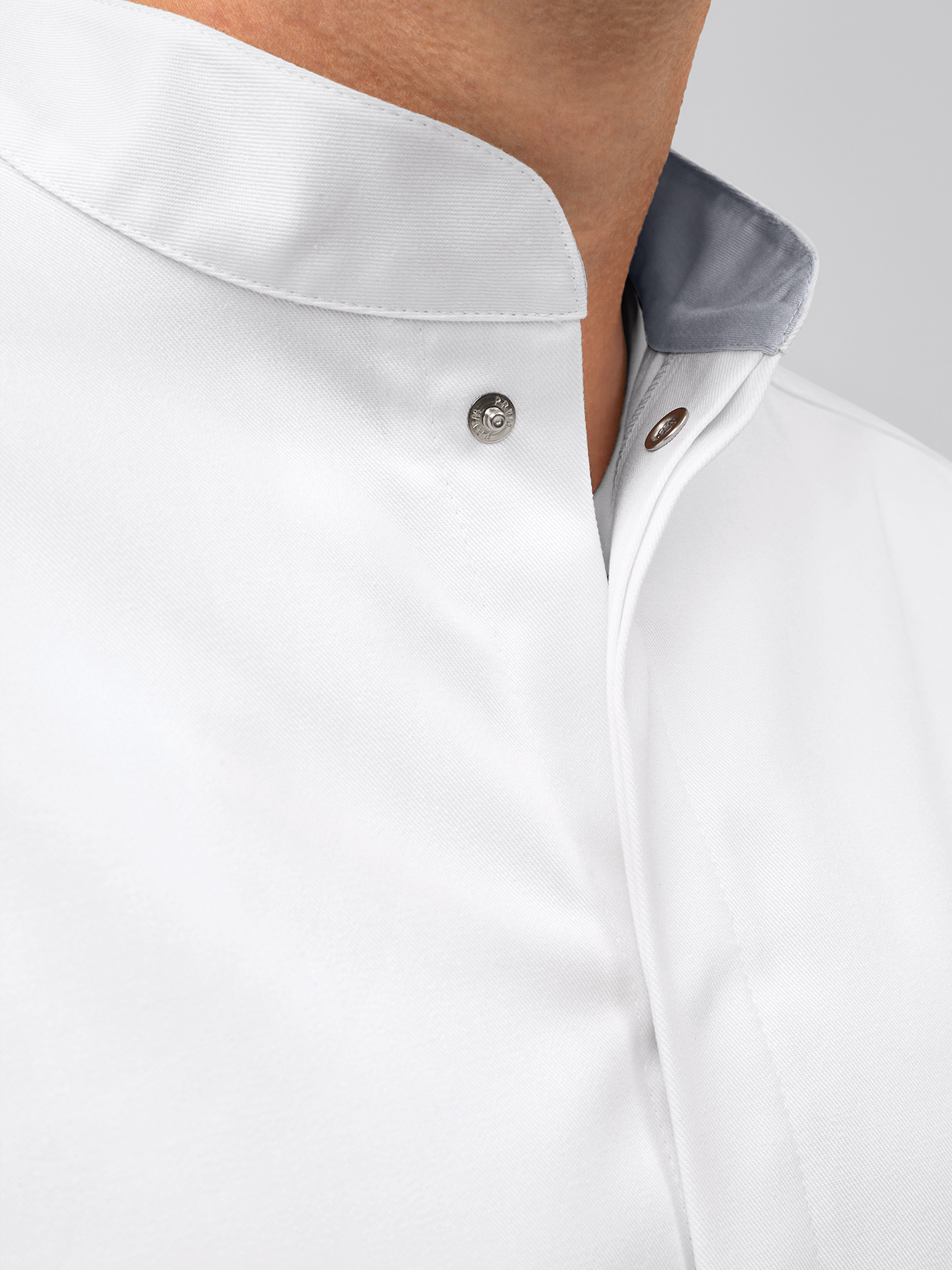 Kurzarmmantel mit Stehkragen und verdeckter Druckknopfleiste. Kontrastfarbener Innenkragen, 1 Brusttasche mit abgetrennter Kugelschreibertasche, 2 große Taschen, rückwärtiger Gehschlitz, Rückenlänge Gr. M ca. 96 cm. 65% Polyester/35% Baumwolle, 245 g/m2, feste Webware, 95°-Wäsche, trocknergeeignet. Die Lieferung erfolgt ohne weiteres, abgebildetes Zubehör.