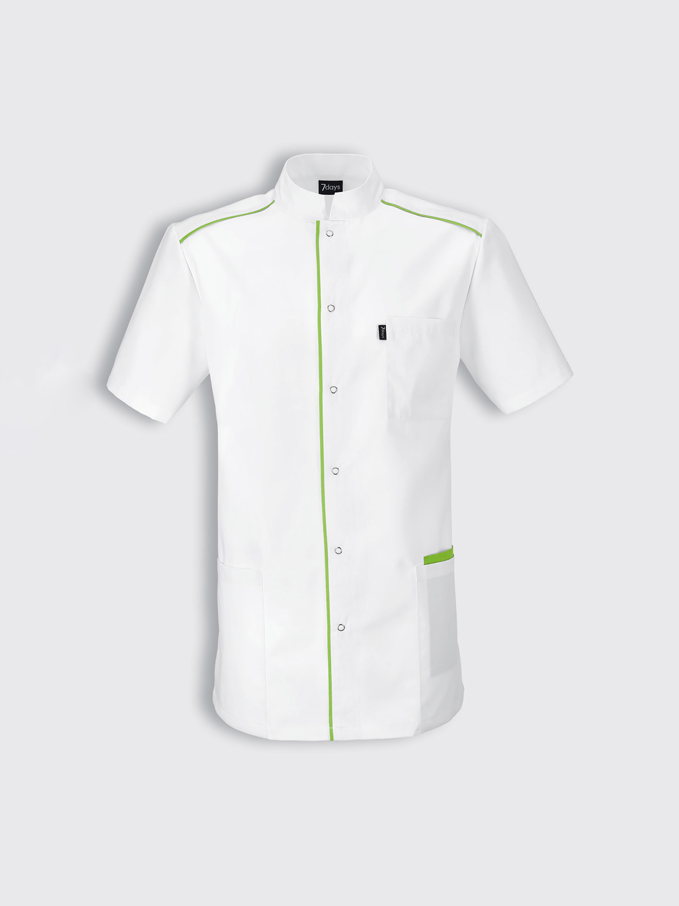 Stehkragen, Druckknopfleiste, Brusttasche mit abgetrennter Kulitasche, 3 Eingrifftaschen, kontrastfarbene Besätze, ½-Ärmel, Seitenschlitze, Rückenlänge Gr. M ca. 78 cm. Pflegeleichtes Mischgewebe aus 50% Polyester/50% Baumwolle, weiß = 65% Polyester/35% Baumwolle, 95°-Wäsche, Webware.