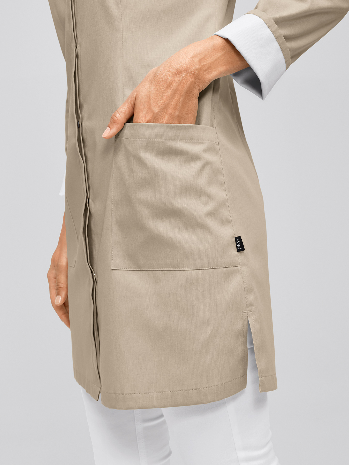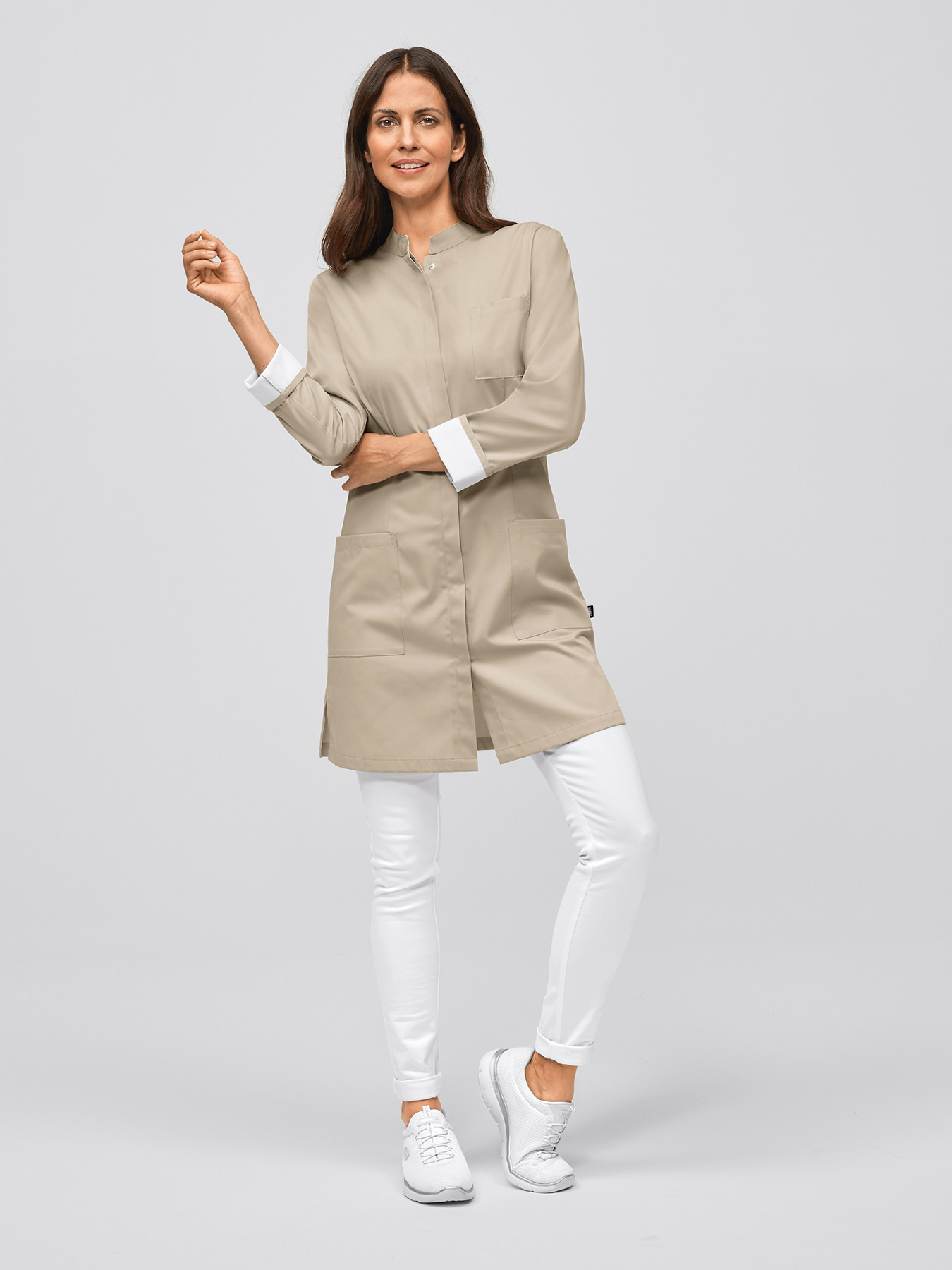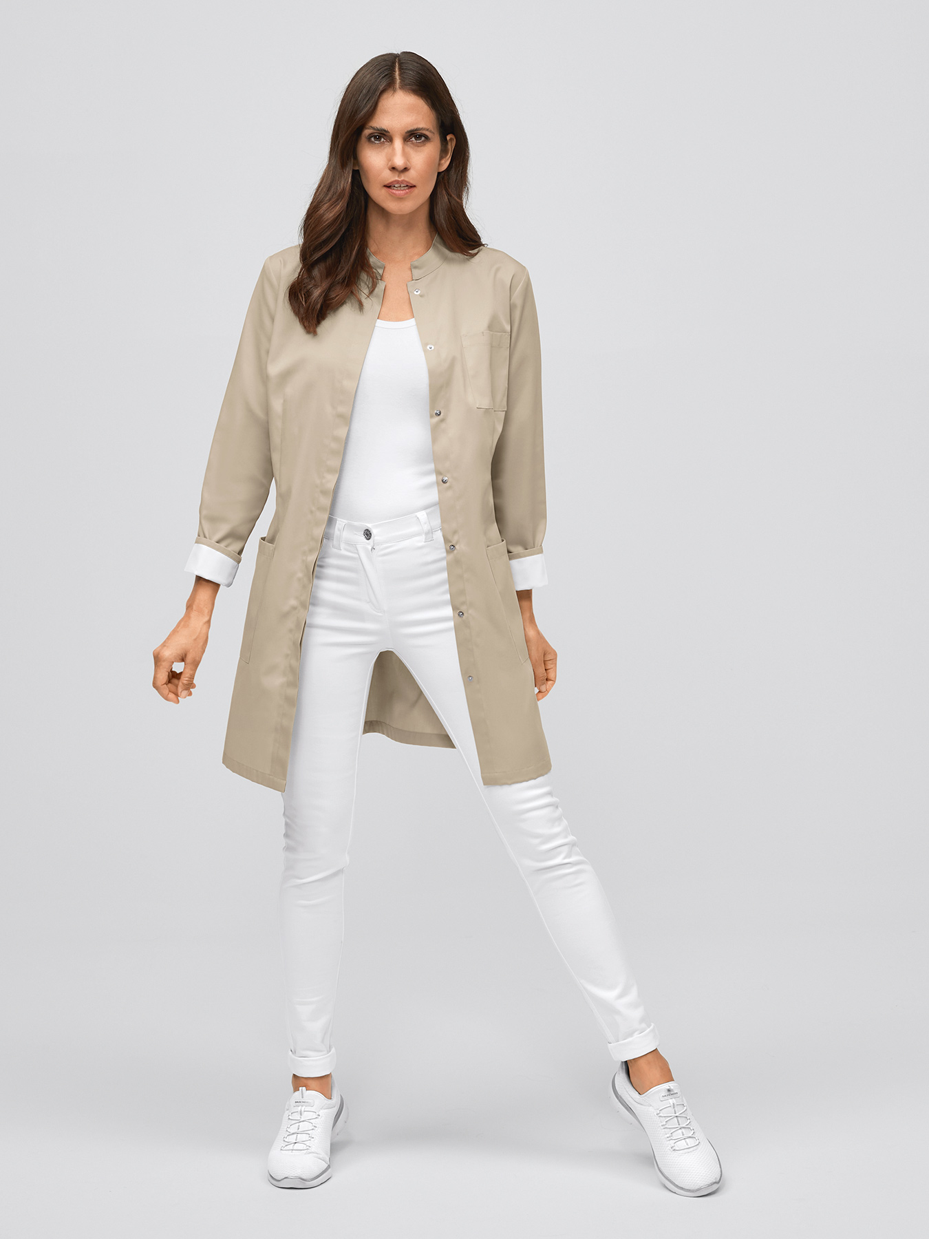 Arztkittel mit kleinem Stehkragen mit kontrastfarbener Innenseite und verdeckter Druckknopfleiste, langer Ärmel mit kontrastfarbener Innenseite, ideal zum Aufkrempeln, 1 aufgesetzte Brusttasche mit abgetrennter Kulitasche, 2 aufgesetzte große Taschen, figurbetonende Abnäher, Seitenschlitze, Rückenlänge Gr. 36 ca. 85 cm. Weiß = 65% Polyester/35% Baumwolle, 195 g/m2, schwarz + beige = 50% Polyester/50% Baumwolle, 150 g/m², Webware, 95°-Wäsche, trocknergeeignet. Die Lieferung erfolgt ohne weiteres, abgebildetes Zubehör.