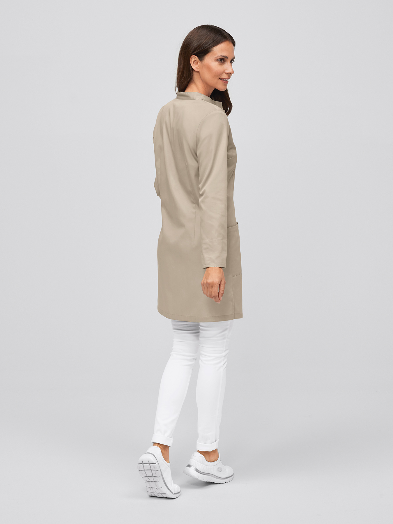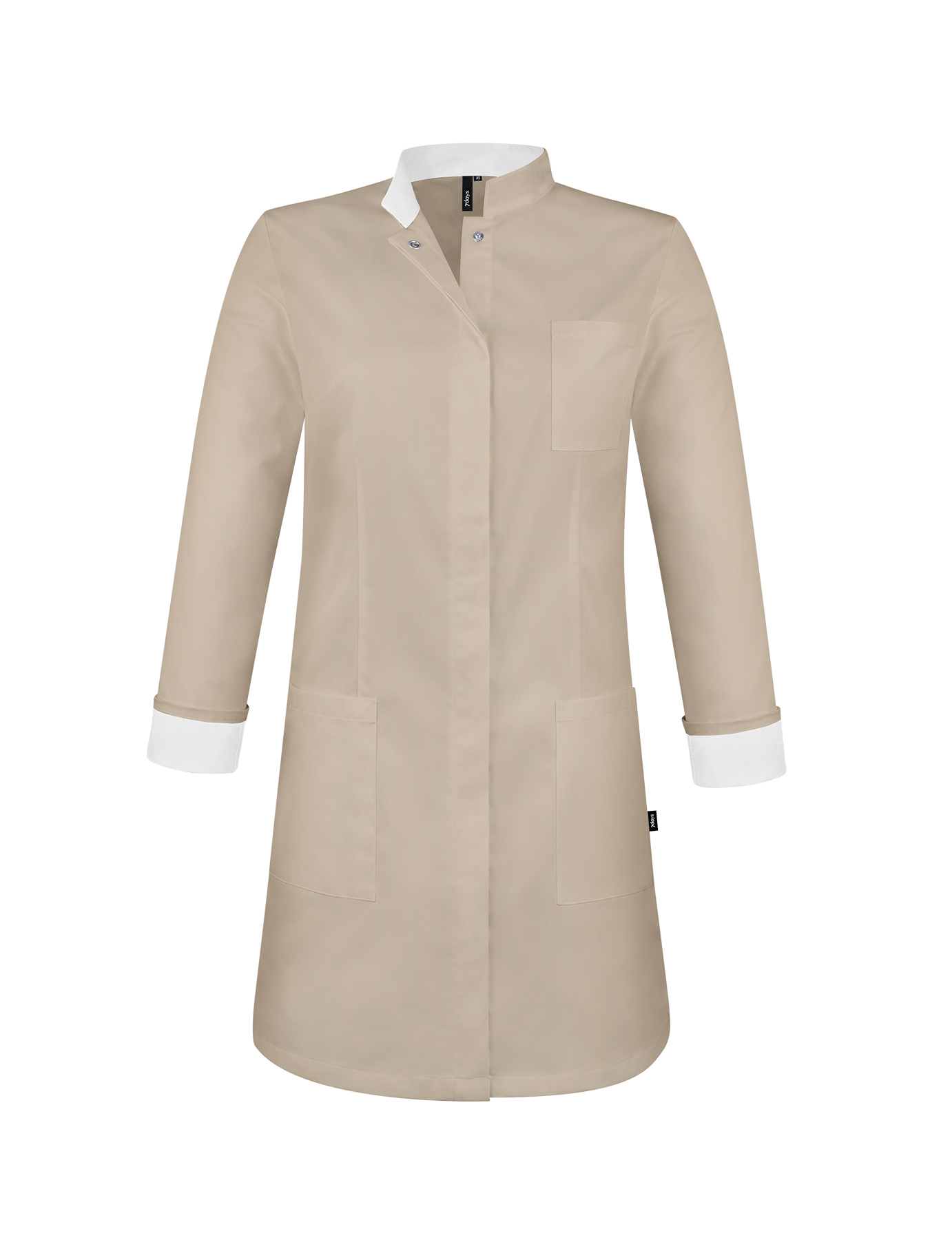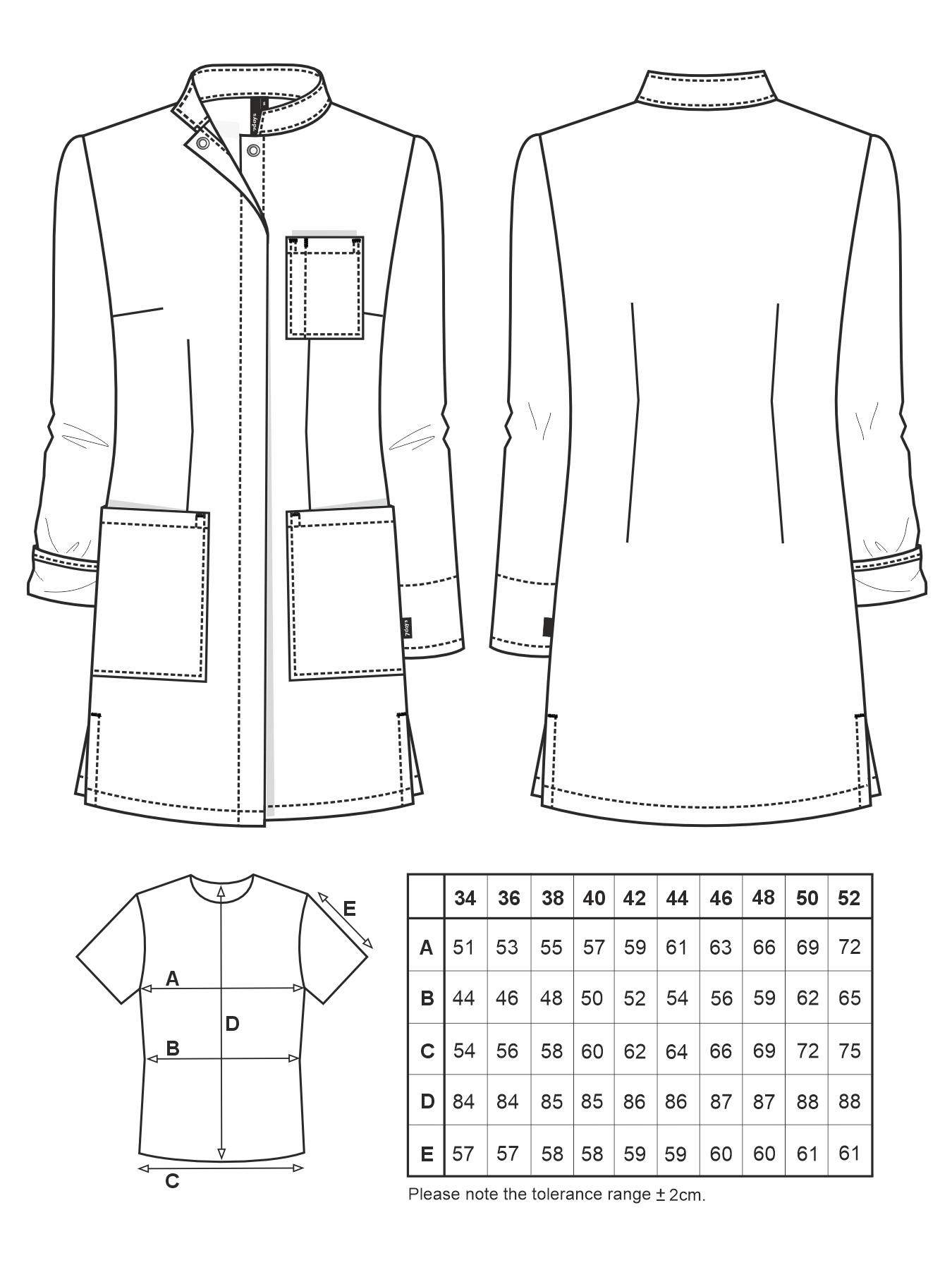 Arztkittel mit kleinem Stehkragen mit kontrastfarbener Innenseite und verdeckter Druckknopfleiste, langer Ärmel mit kontrastfarbener Innenseite, ideal zum Aufkrempeln, 1 aufgesetzte Brusttasche mit abgetrennter Kulitasche, 2 aufgesetzte große Taschen, figurbetonende Abnäher, Seitenschlitze, Rückenlänge Gr. 36 ca. 85 cm. Weiß = 65% Polyester/35% Baumwolle, 195 g/m2, schwarz + beige = 50% Polyester/50% Baumwolle, 150 g/m², Webware, 95°-Wäsche, trocknergeeignet. Die Lieferung erfolgt ohne weiteres, abgebildetes Zubehör.