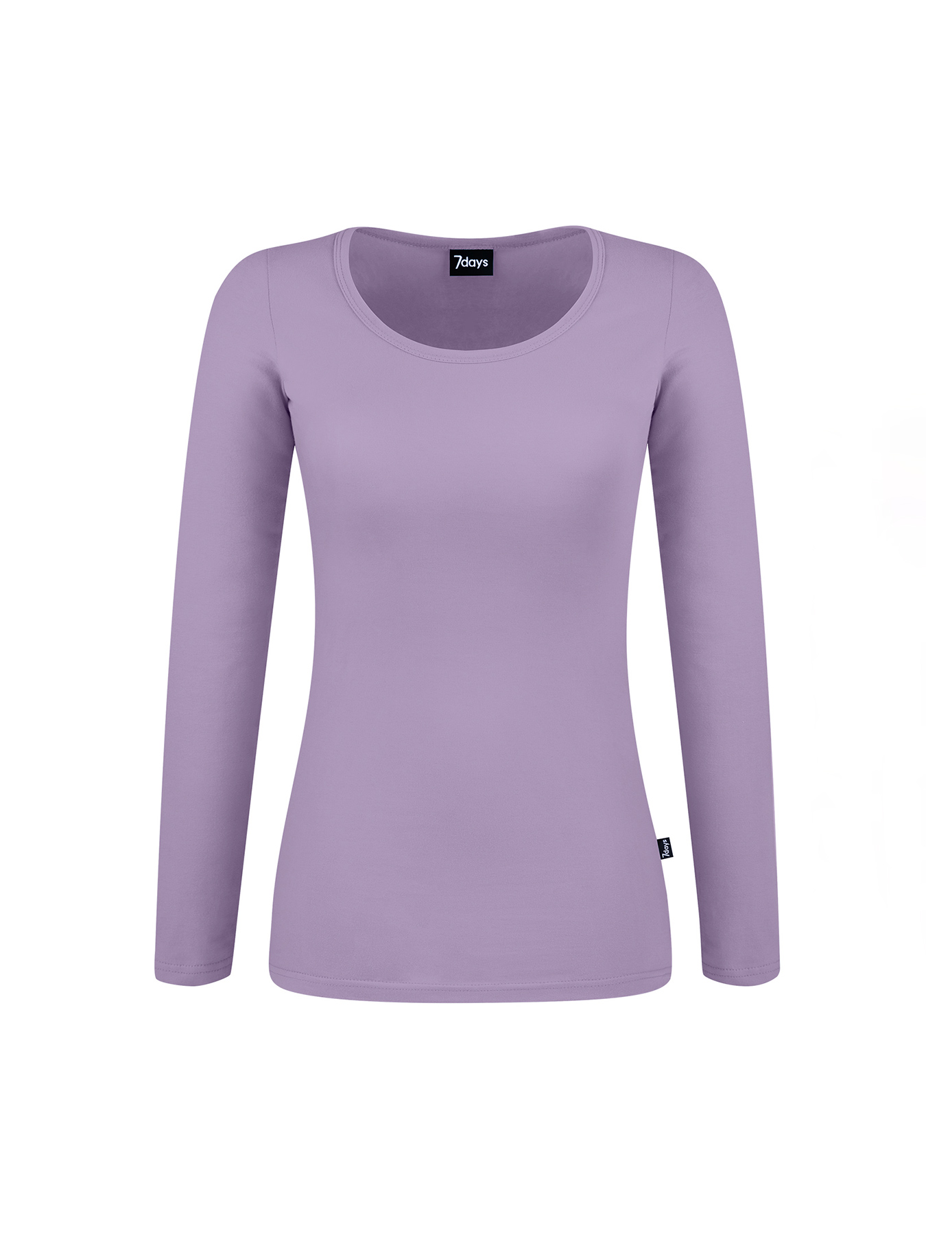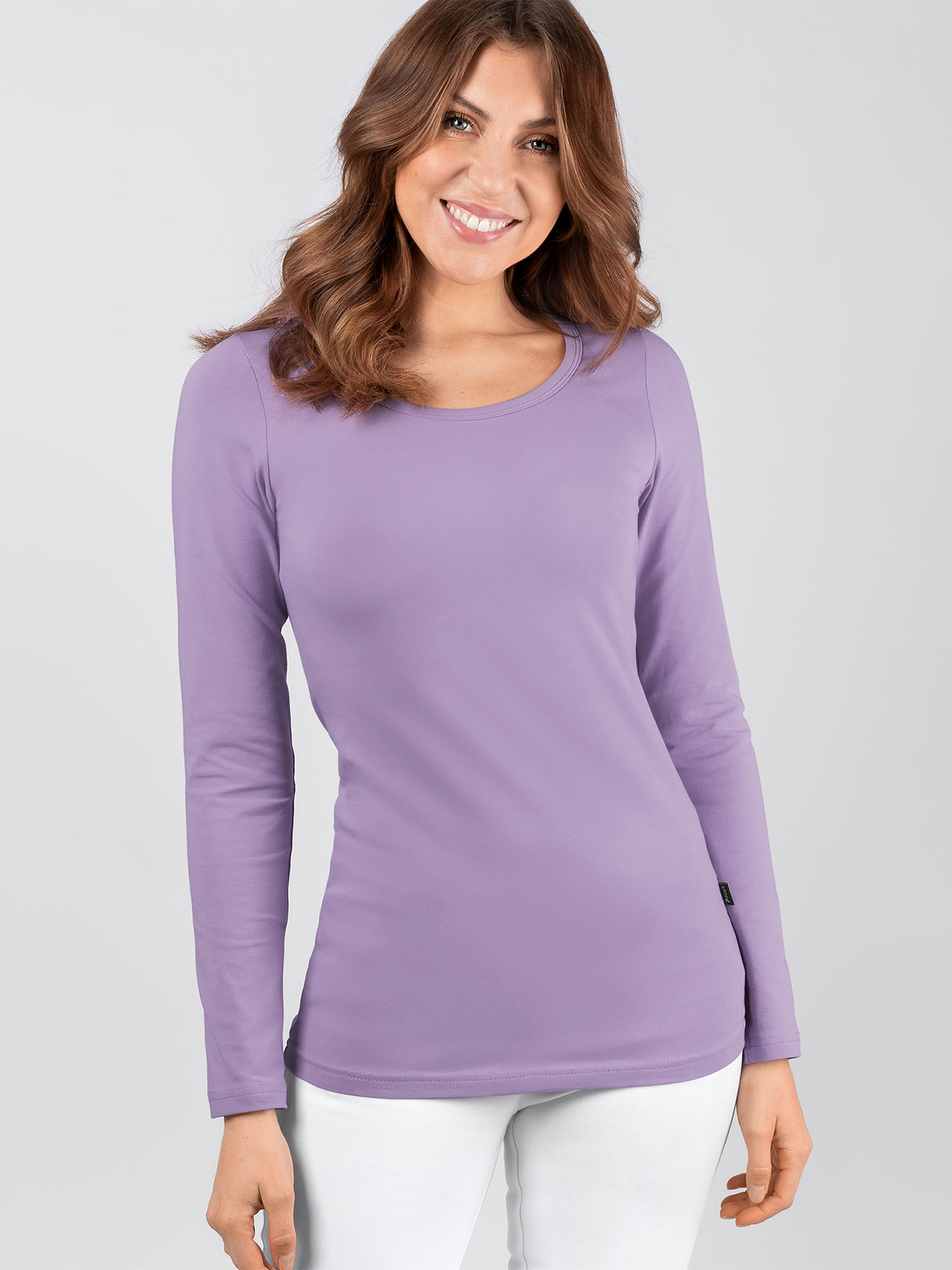 Rundhalsausschnitt mit langem Arm, körpernah und lang geschnitten, Rückenlänge ca. 68 cm. Formstabil und elastisch aus 95% Baumwolle/5% Elasthan, 180 g/m2, Single Jersey, 40°-Wäsche.