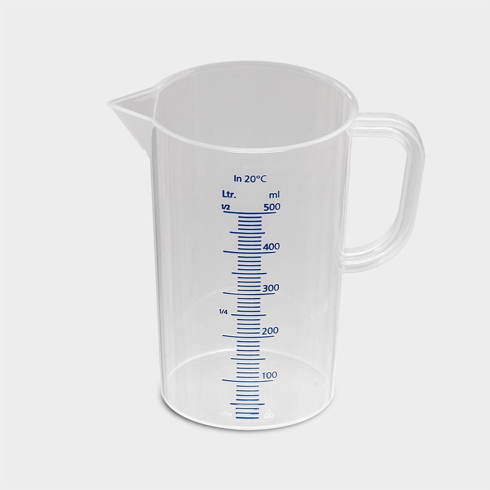 Transparente Meßkanne mit blauer Skala zum Abmessen von Flüssigkeiten. Fassungsvermögen 500 ml.