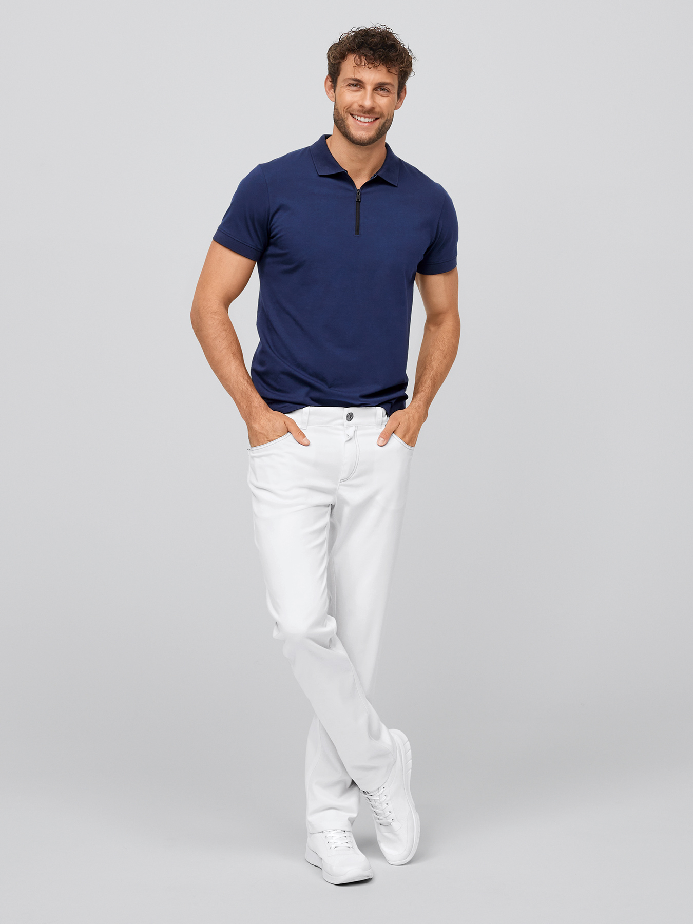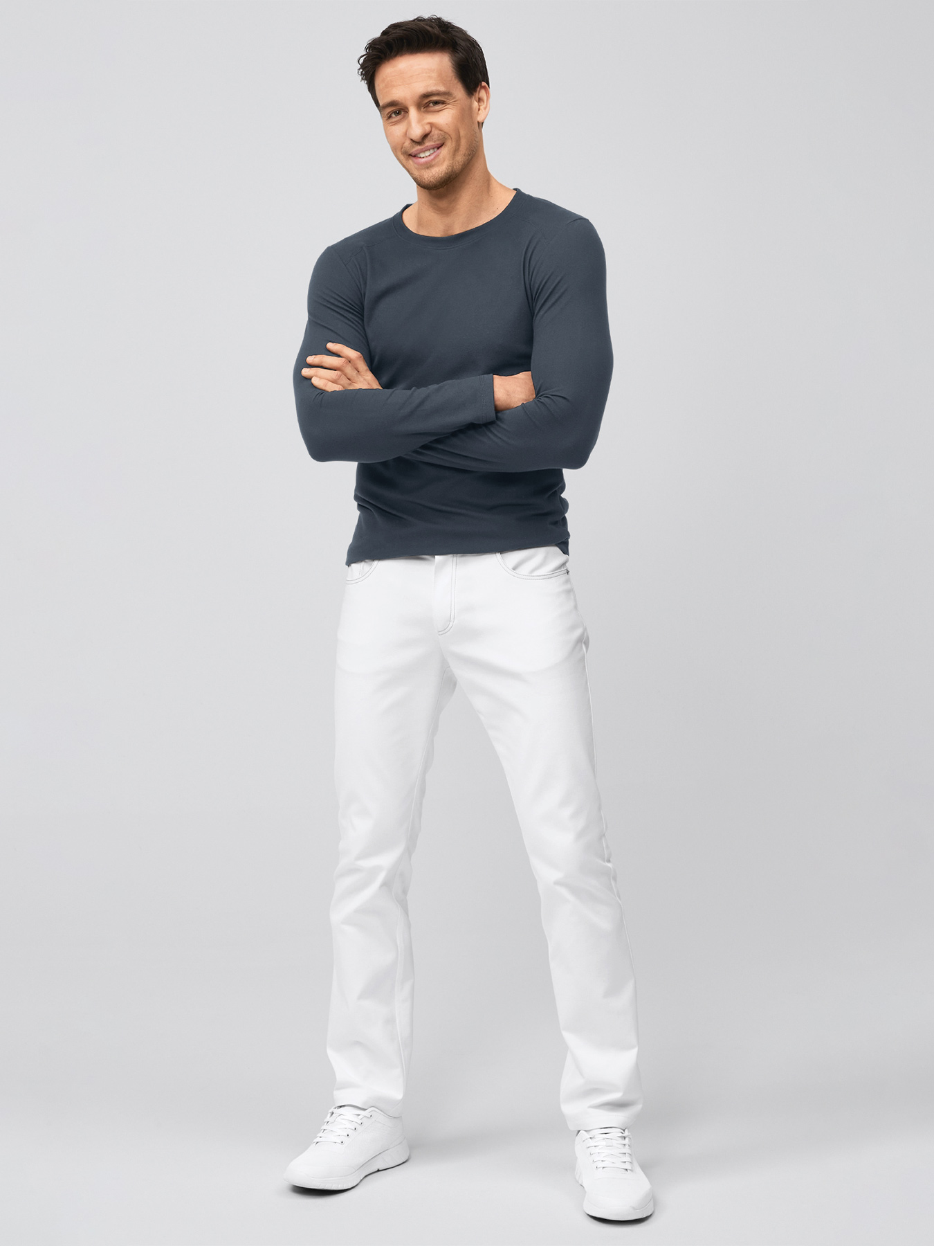 Moderne 5-Pocket-Hose, normale Leibhöhe, gerades, etwas schmaler geschnittenes Bein, Schrittlänge ca. 83 cm. Knitterarme und bügelleichte Qualität aus 64% Baumwolle/35% Polyester/1% Elasthan, 300 g/m², 60°-Wäsche.