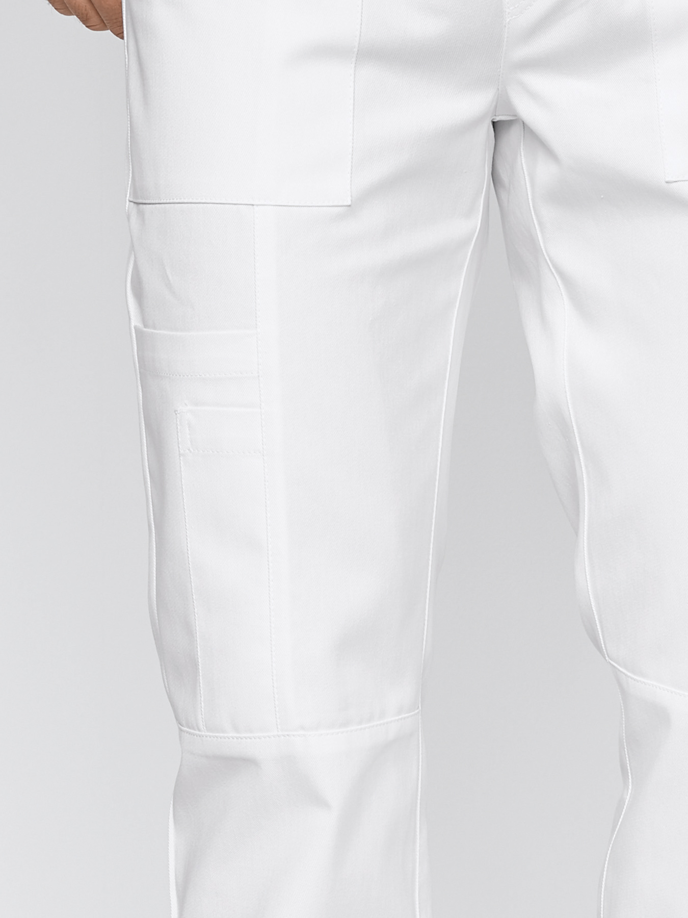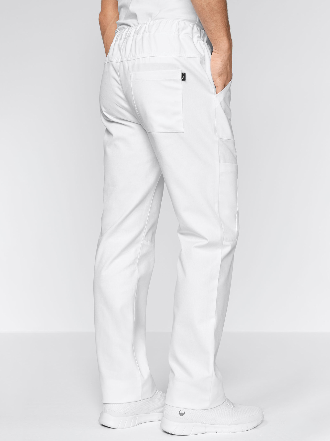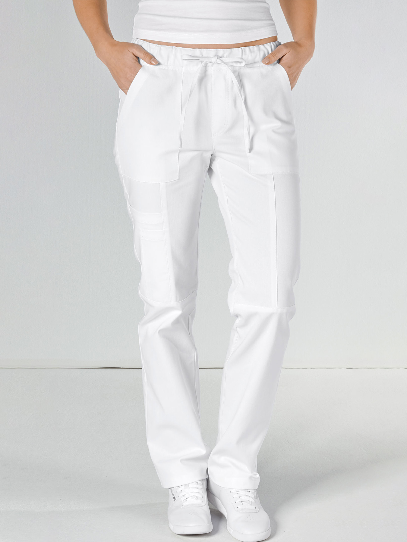 Gummibund mit kontrastfarbigem Bindeband, gerade geschnittenes Bein mit 2 Fronteingrifftaschen, 1 Gesäßtasche, aufgesetzte Beintaschen rechts, Schrittlänge ca. 82 cm. Weiß: 65% Polyester/35% Baumwolle, 245 g/m², Weiß: 100% Baumwolle, 240 g/m² Farben: 50% Polyester/50% Baumwolle, 150 g/m², pflegeleichtes Mischgewebe, 95°-Wäsche, Webware. Die Lieferung erfolgt ohne weiteres, abgebildetes Zubehör.