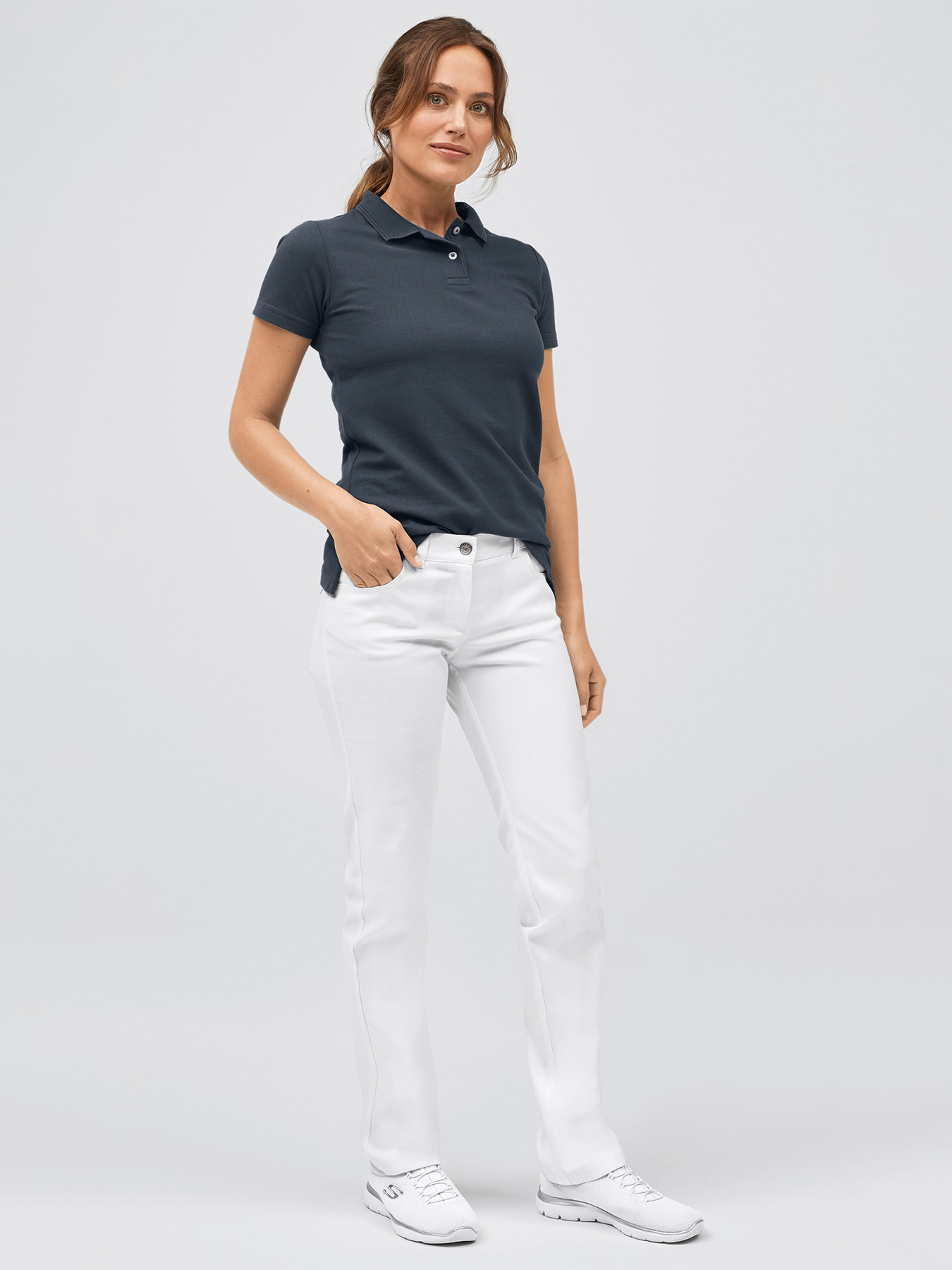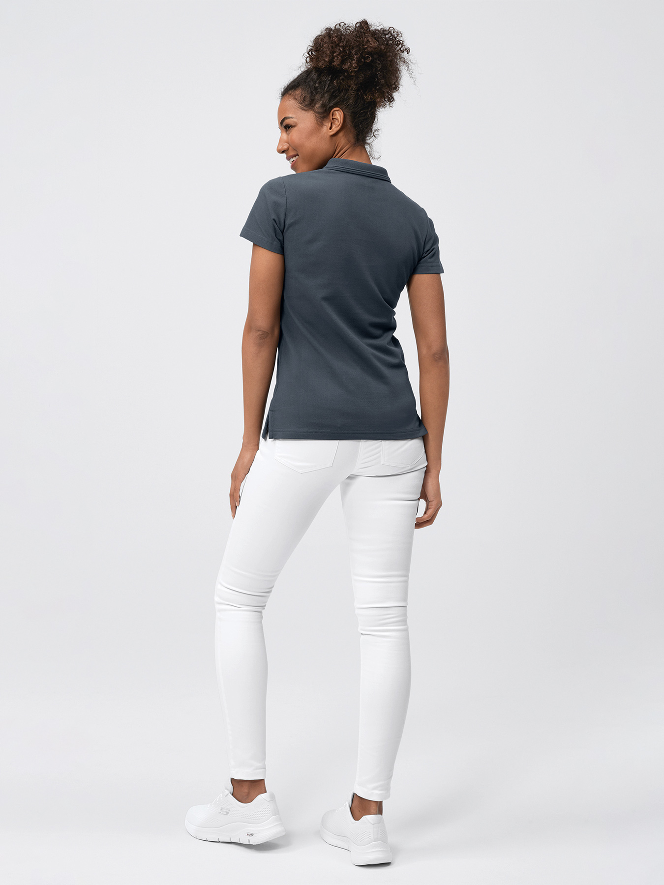 Damen-Poloshirt mit kurzer Knopfleiste, ¼-Arm, Seitenschlitze, Rückenlänge Gr. S ca. 65 cm, figurbetonend geschnitten. 85% Baumwolle/15% Polyester, 190 g/m2, Piquéware, 90°-Wäsche, nicht trocknergeeignet.