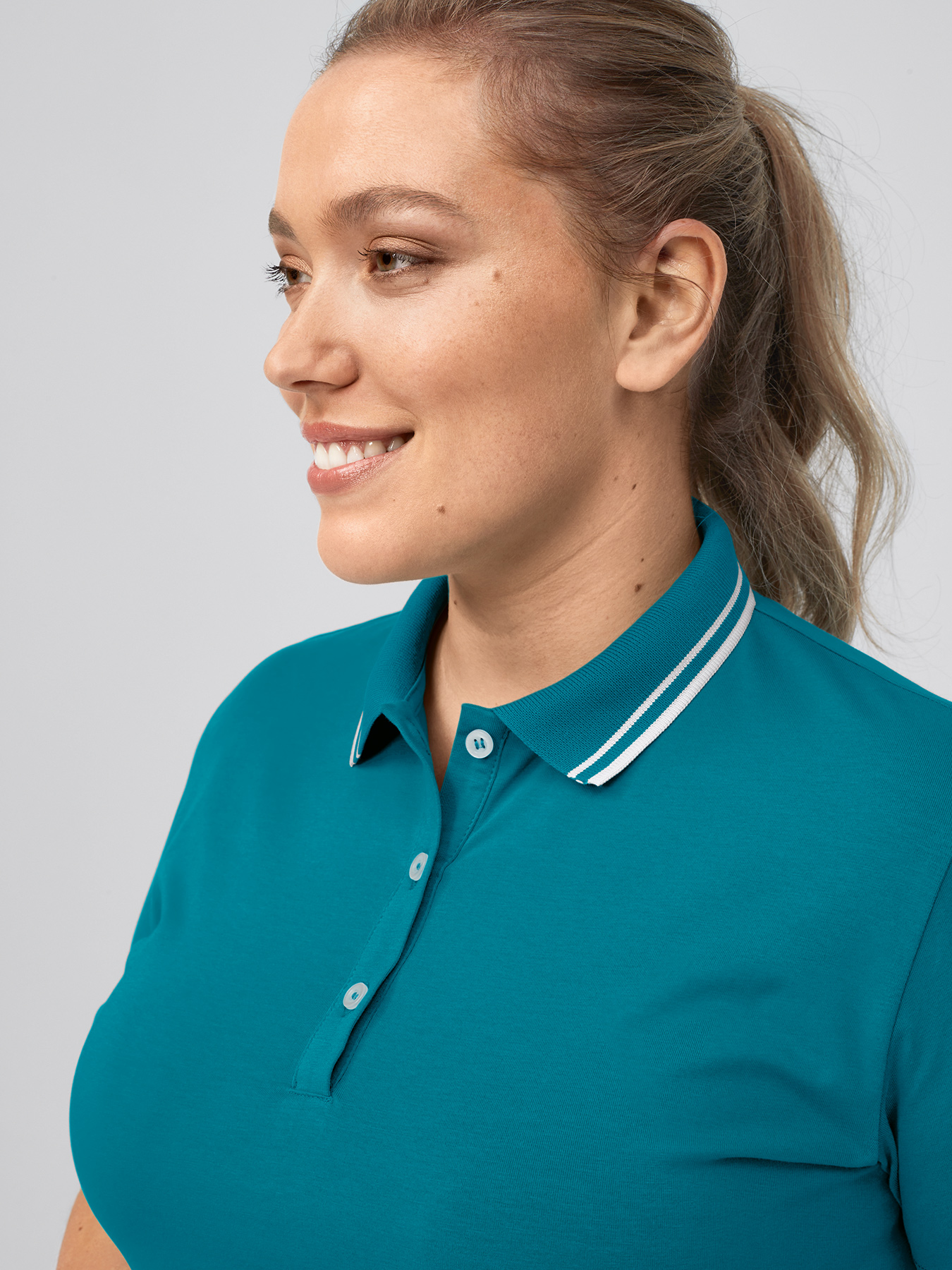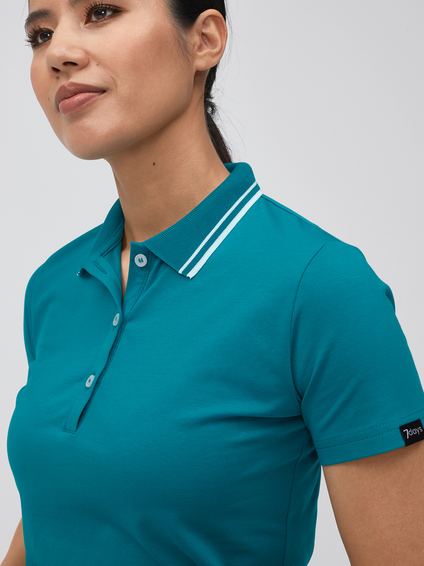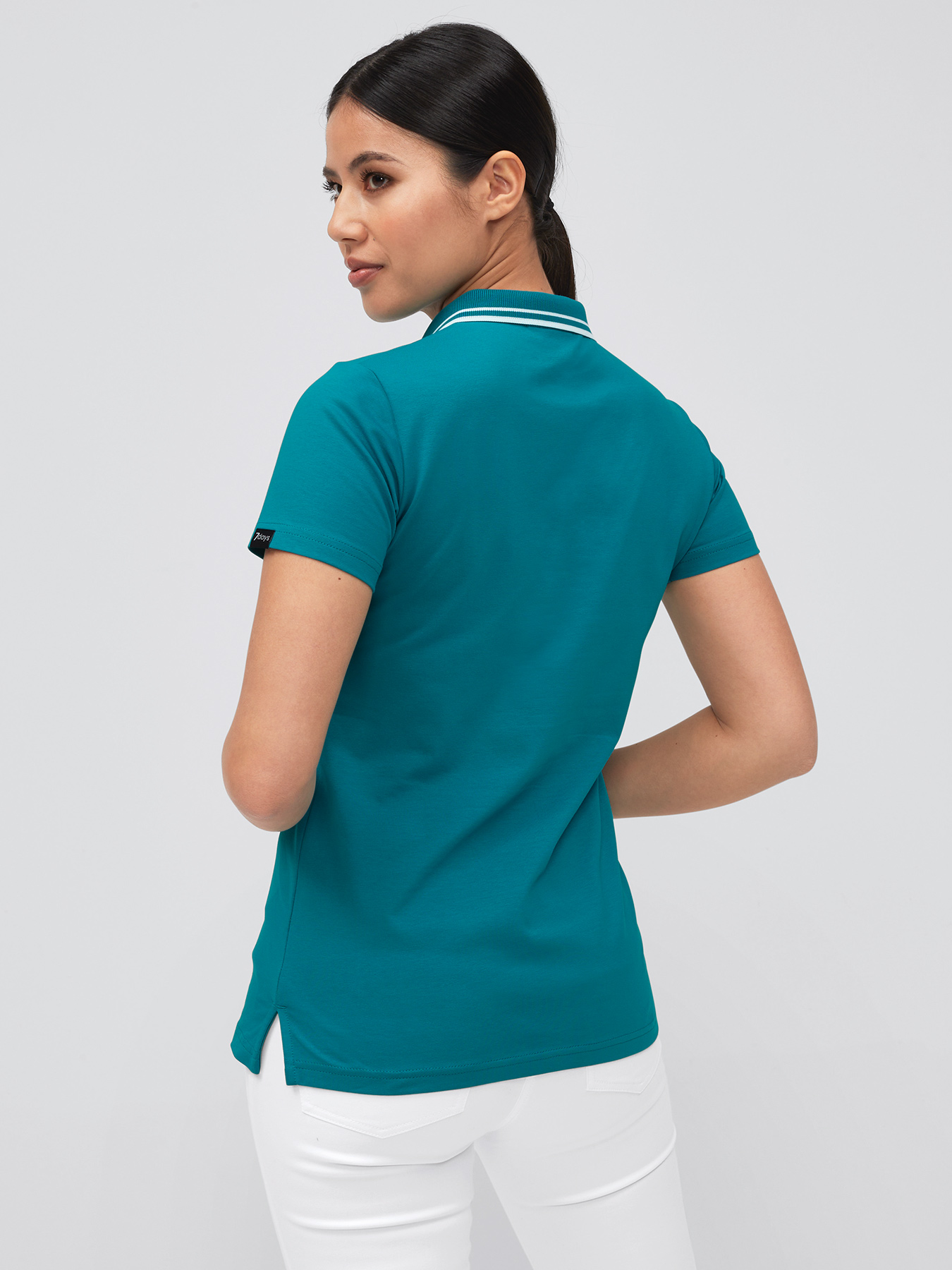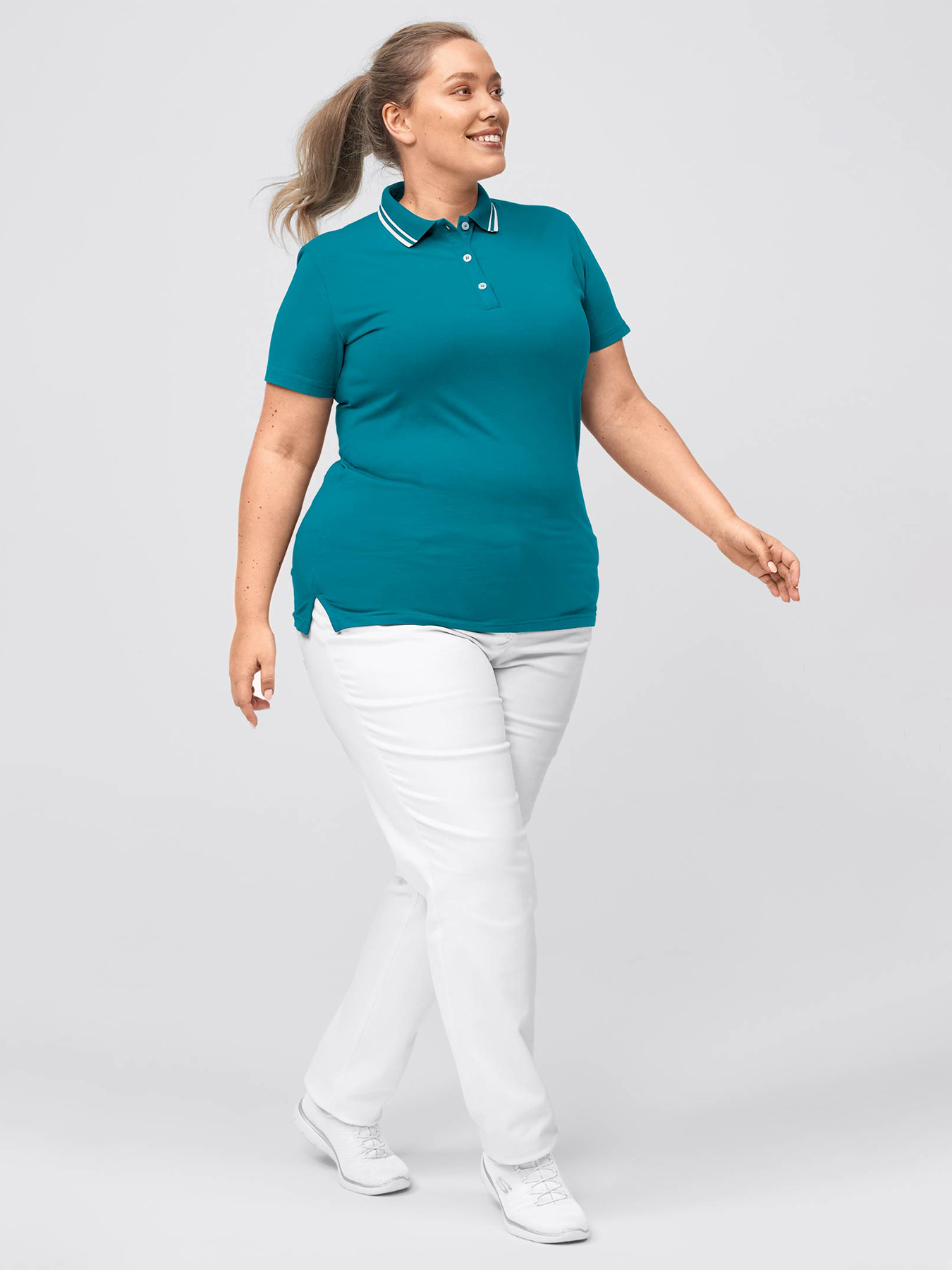 Figurbetonendes Damen-Poloshirt, 3-Loch-Knopfleiste, Strickkragen mit weißen Streifen, ¼-Arm, Seitenschlitze. Rückenlänge Gr. S ca. 65 cm. Formstabile und elastische Qualität aus 95% Baumwolle/5% Elasthan, 180 g/m2, Single Jersey, 60°-Wäsche.
