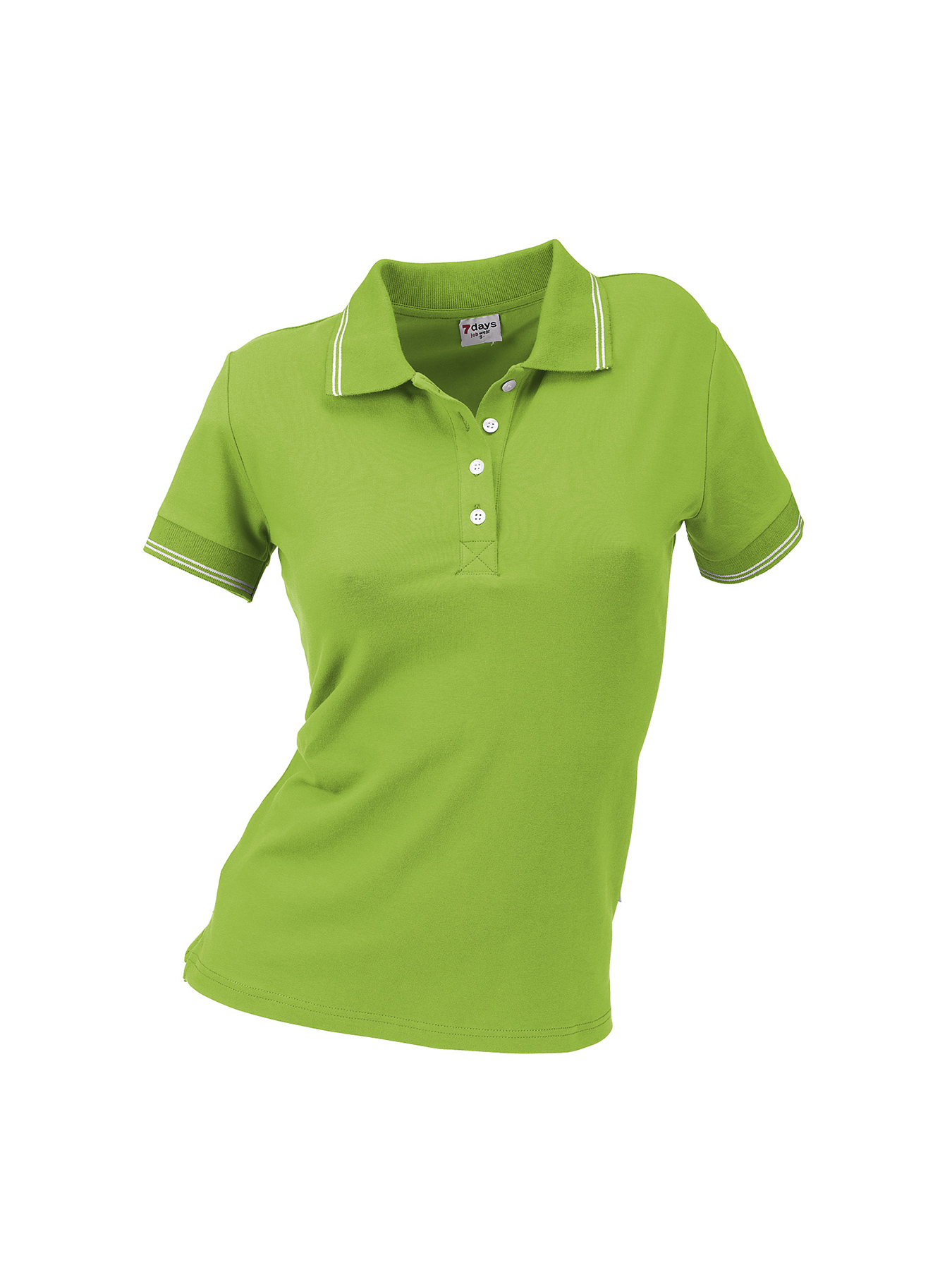 Polokragen und Ärmelabschlüsse mit Strickbündchen und 2 weißen Kontraststreifen, schmale Knopfleiste, ¼-Arm, figurbetonend geschnitten, Seitenschlitze, Rückenlänge ca. 63 cm bei Gr. S. Formstabil und elastisch aus 95% Baumwolle/5% Elasthan, 40°-Wäsche, Single Jersey, 180 g/m², Stretchware.