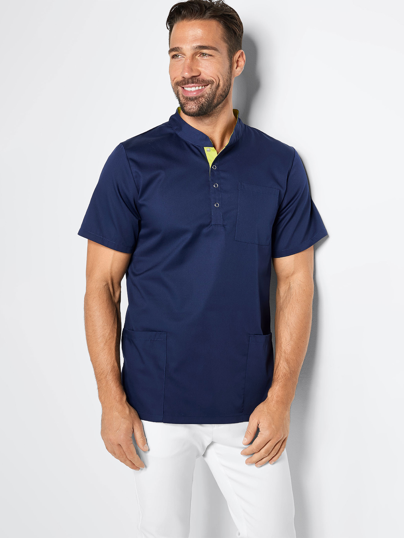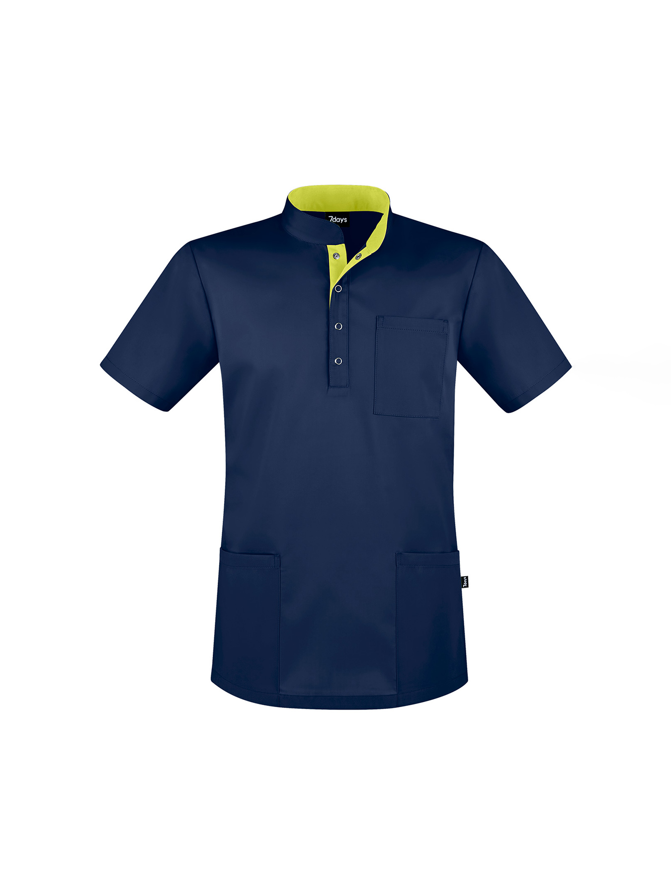 Stehkragen mit Druckknöpfen, Kontrastfarbe im Kragen. 2 Eingrifftaschen, 1 Brusttasche, bequeme Seitenschlitze, Rückenlänge bei Gr. M ca. 75 cm. 50% Polyester/50% Baumwolle, weiß = 65% Polyester/35% Baumwolle, alle 95°-Wäsche, außer blue curacao = 60°-Wäsche, Webware.