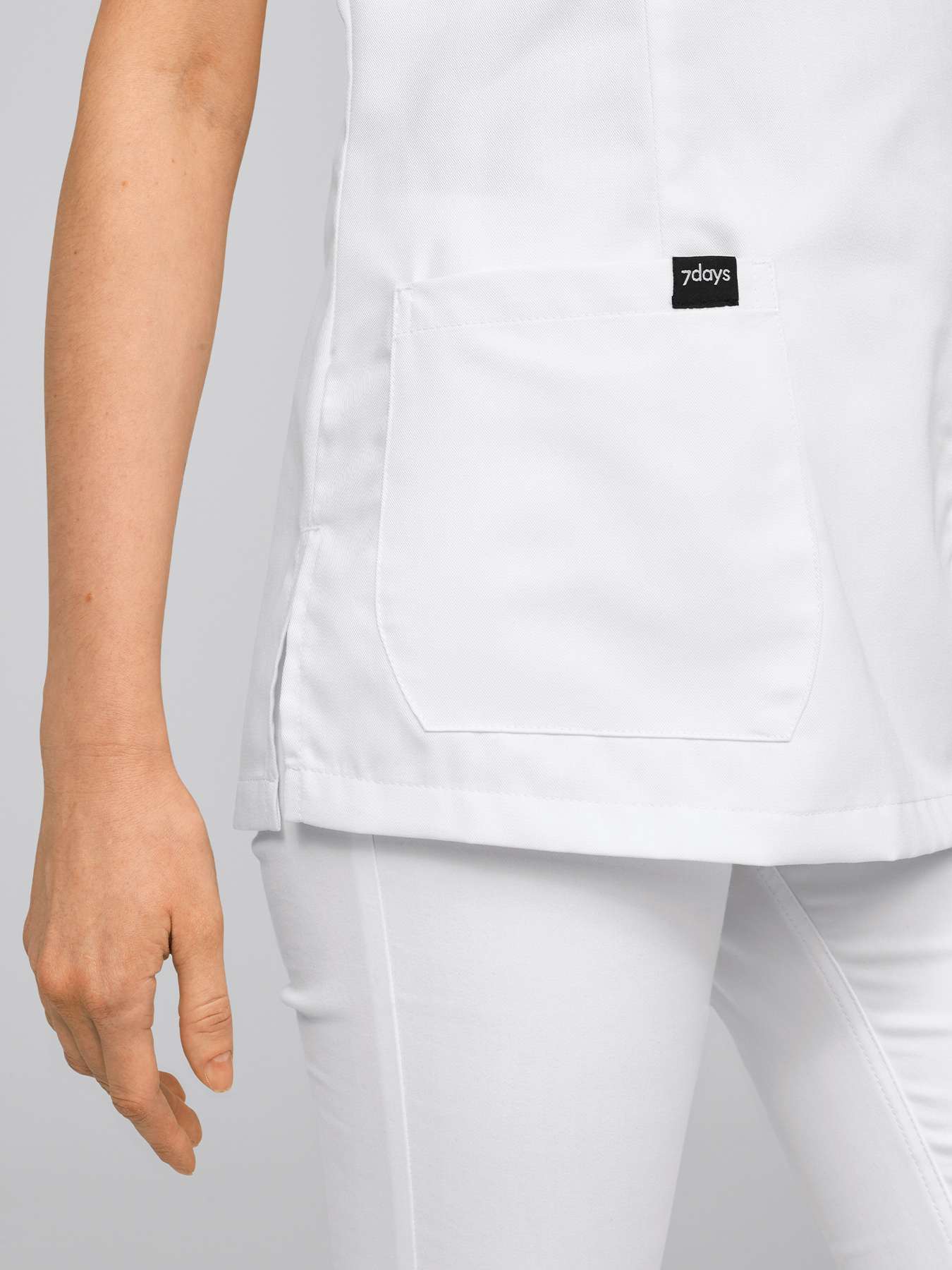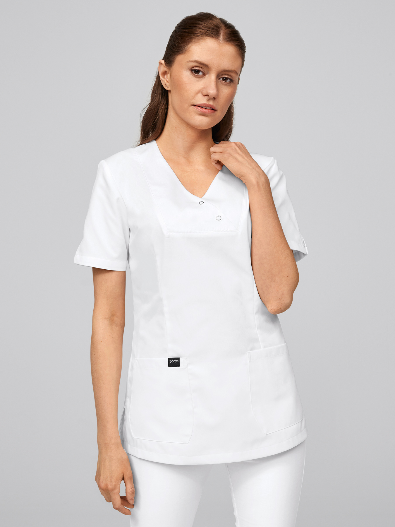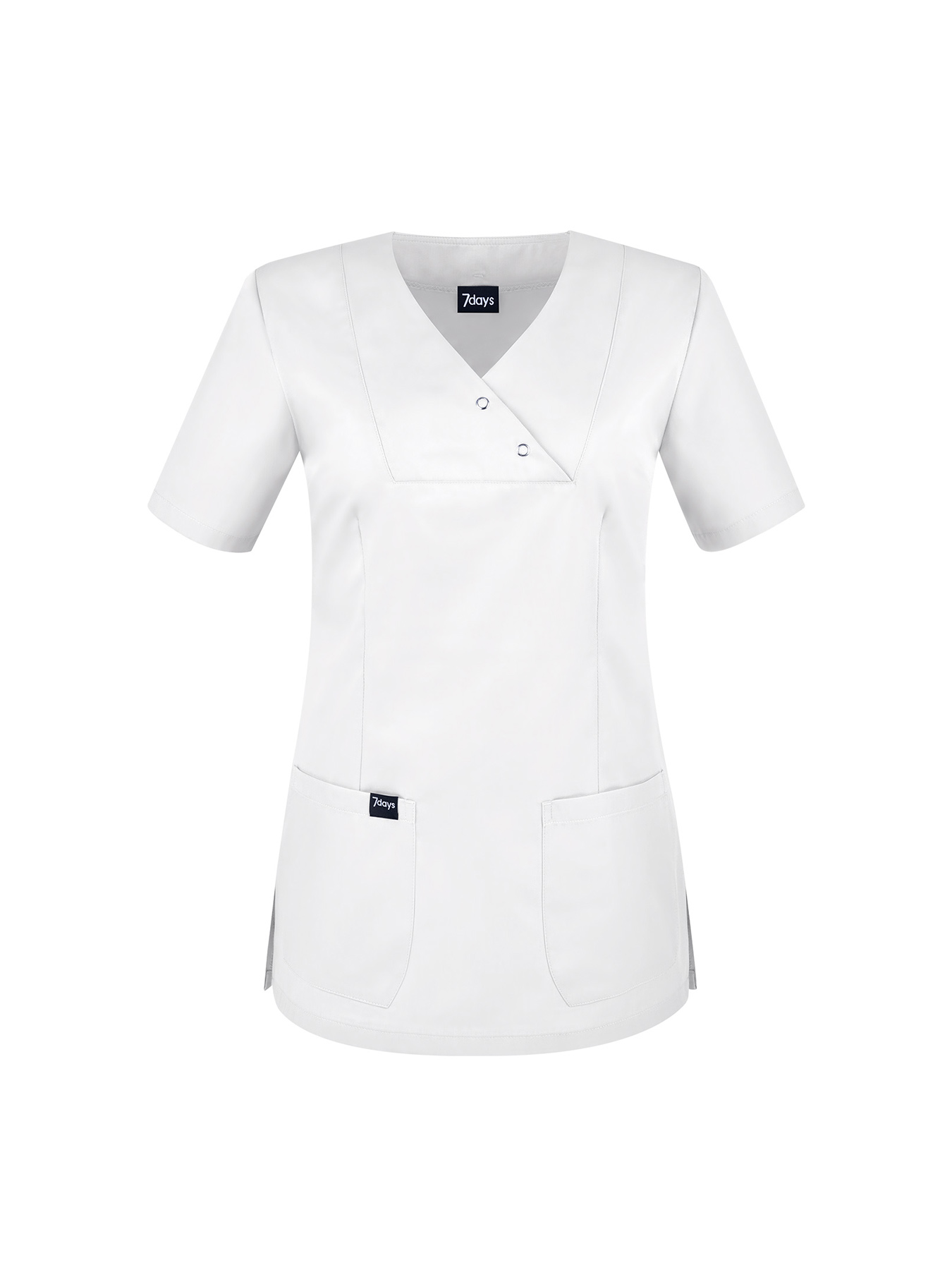 V-Ausschnitt mit 2 Druckknöpfen, geschlitzte ½-Ärmel, 2 aufgesetzte Taschen, figurbetonend durch Abnäher, abgerundeter Saum mit Seitenschlitzen, Rückenlänge Gr. S ca. 70 cm. 65% Polyester/35% Baumwolle, 210 g/m², alle 95°-Wäsche, nicht chlorbar, trocknergeeignet, Webware.