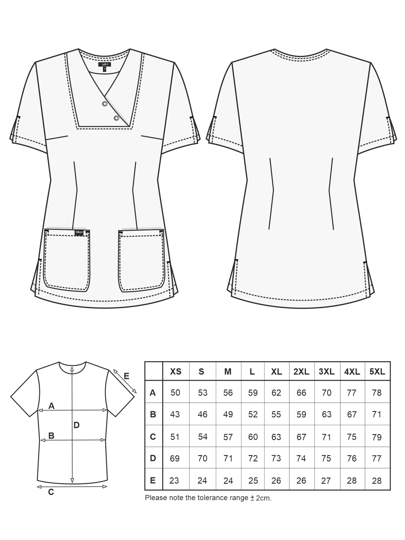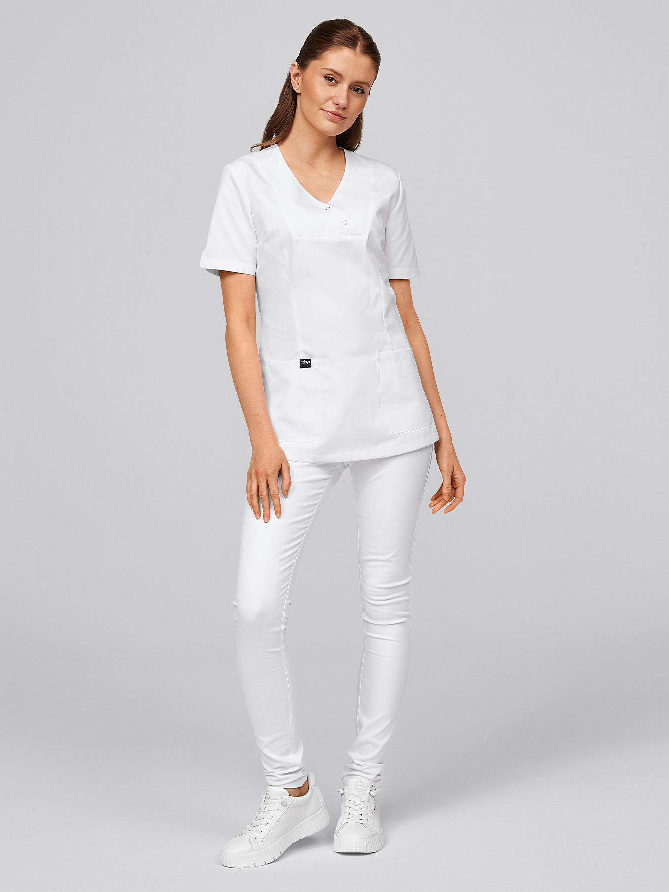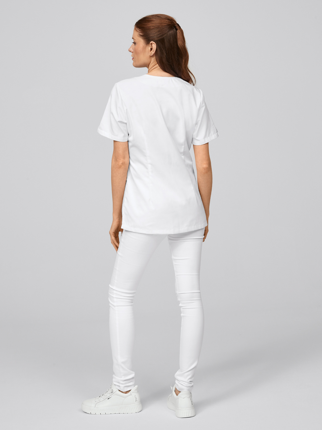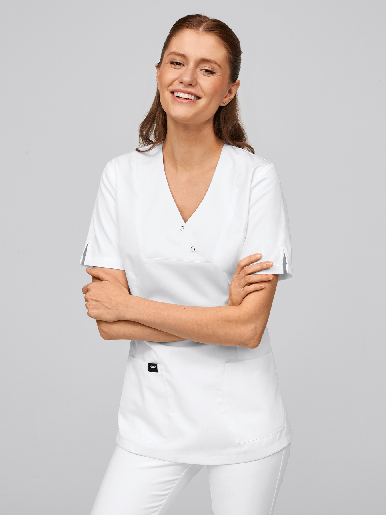 V-Ausschnitt mit 2 Druckknöpfen, geschlitzte ½-Ärmel, 2 aufgesetzte Taschen, figurbetonend durch Abnäher, abgerundeter Saum mit Seitenschlitzen, Rückenlänge Gr. S ca. 70 cm. 65% Polyester/35% Baumwolle, 210 g/m², alle 95°-Wäsche, nicht chlorbar, trocknergeeignet, Webware.