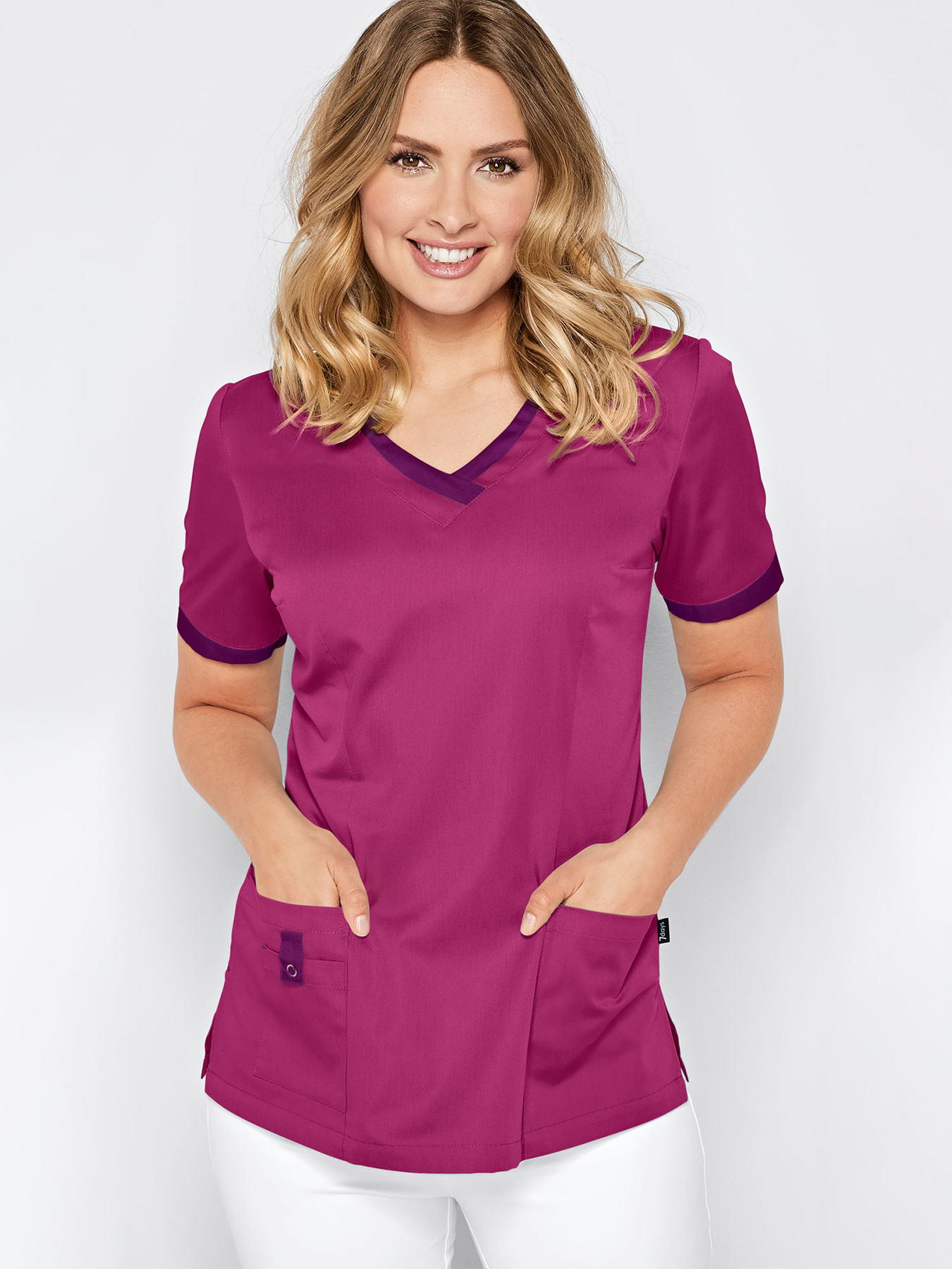V-Ausschnitt und ¼-Arm mit kontrastfarbigem Besatz, figurbetonende Abnäher, 2 große Taschen + 1 kleine Tasche mit Druckknopf zum Schließen, bequeme Seitenschlitze, Rückenlänge Gr. S ca. 67 cm. 50% Polyester/50% Baumwolle, 150 g/m², Weiß = 65% Polyester/35% Baumwolle, 195 g/m², 95°-Wäsche, außer blue curacao + aruba blue = 60°-Wäsche, nicht chlorbar, alle Farben trocknergeeignet, Webware.