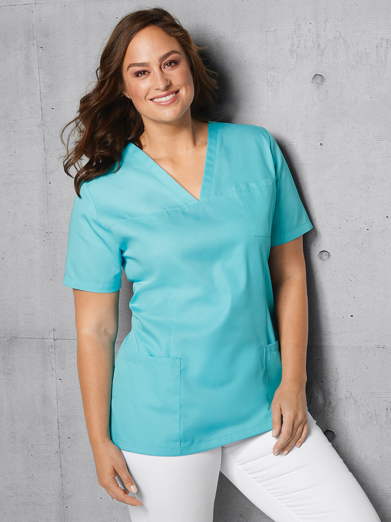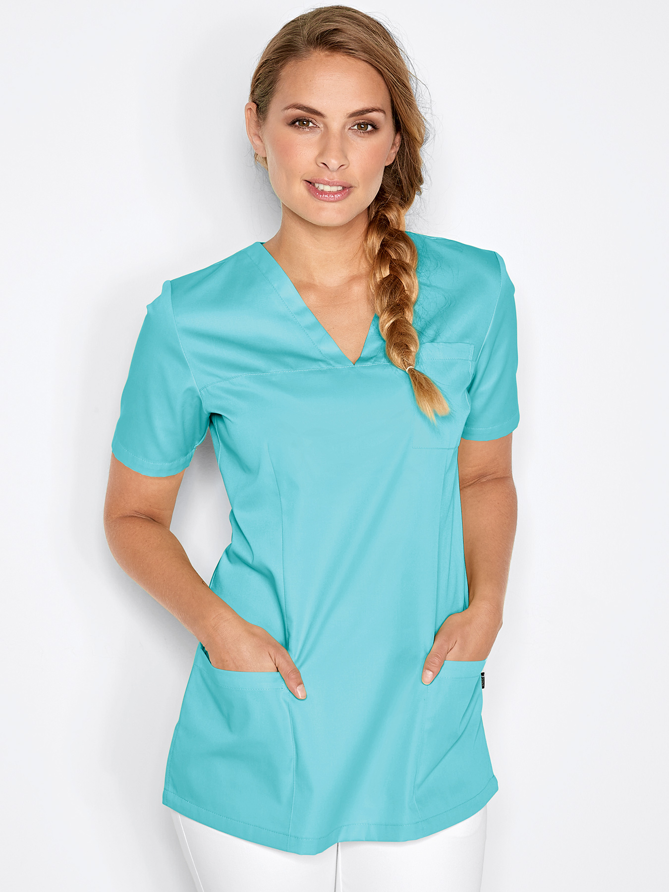 V-Ausschnitt, 1 aufgesetzte Brust-, 2 aufgesetzte Taschen, Teilungsnaht, figurbetonende Abnäher vorne + hinten, bequeme Seitenschlitze, Rückenlänge Gr. S ca. 71 cm. Weiß = 65% Polyester/35% Baumwolle, Farben = 50% Polyester/50% Baumwolle, 95°-Wäsche, Industriewäsche geeignet nach EN ISO 15797, außer blue curacao und aruba blue = 60°-Wäsche, nicht chlorbar, Webware, alle Farben trocknergeeignet. Die Lieferung erfolgt ohne Kugelschreiber.