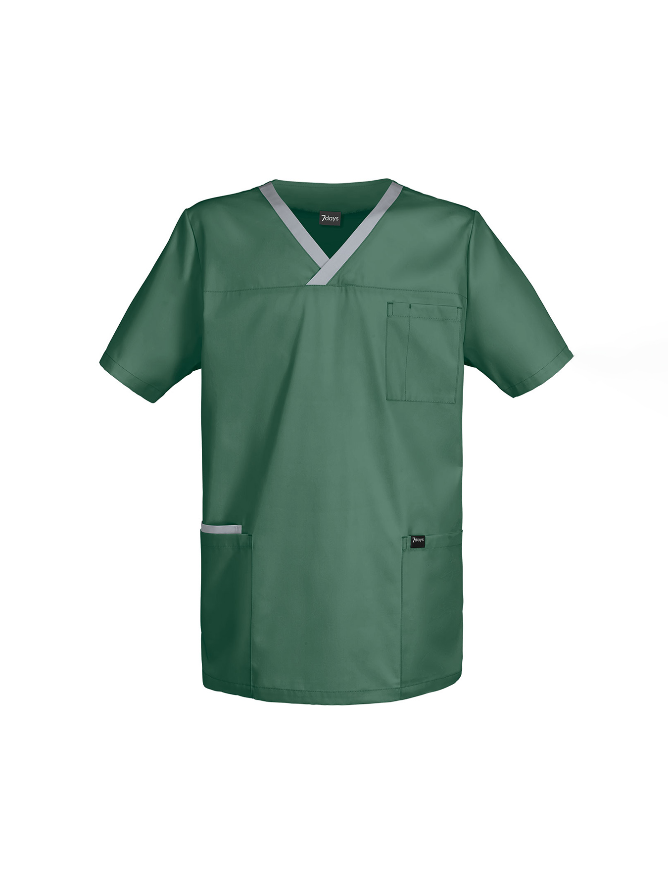 Überschnittener V-Ausschnitt mit kontrastfarbigem Besatz, 1 Brusttasche mit abgetrennter Kulitasche, 2 große Taschen + 1 kleine kontrastfarbige Tasche, lässige Passform, Seitenschlitze, Rückenlänge Gr. M ca. 75 cm. 50% Polyester/50% Baumwolle, 95° waschbar, alle Farben trocknergeeignet, Webware.