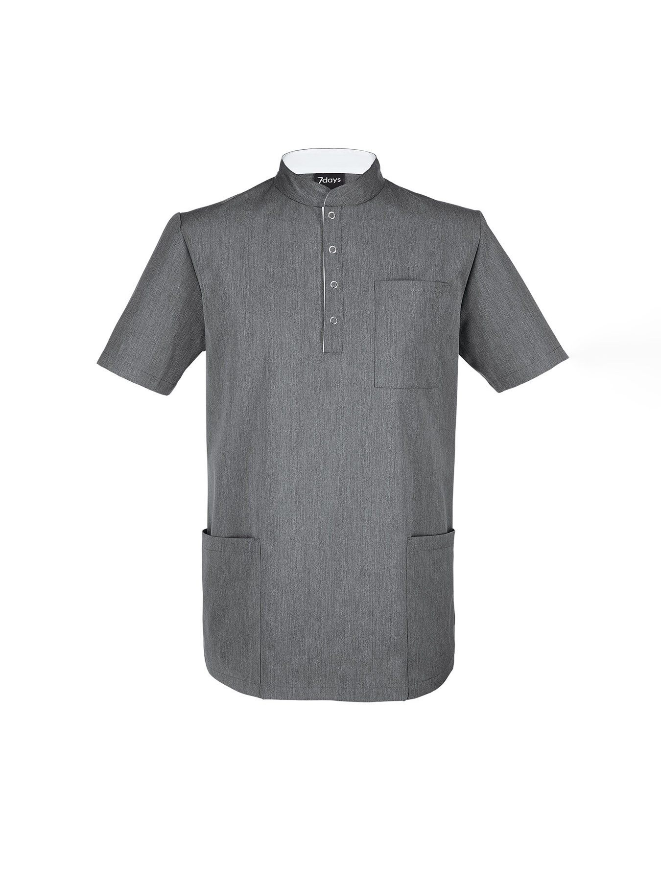 Schlupfkasack mit Stehkragen und Knopfleiste, Kontrastfarbe im Kragen und in der Knopfleiste, 2 Eingrifftaschen, 1 Brusttasche, bequeme Seitenschlitze, Rückenlänge bei Gr. L ca. 77 cm. 50% Polyester/50% Baumwolle, 60°-Wäsche, trocknergeeignet.