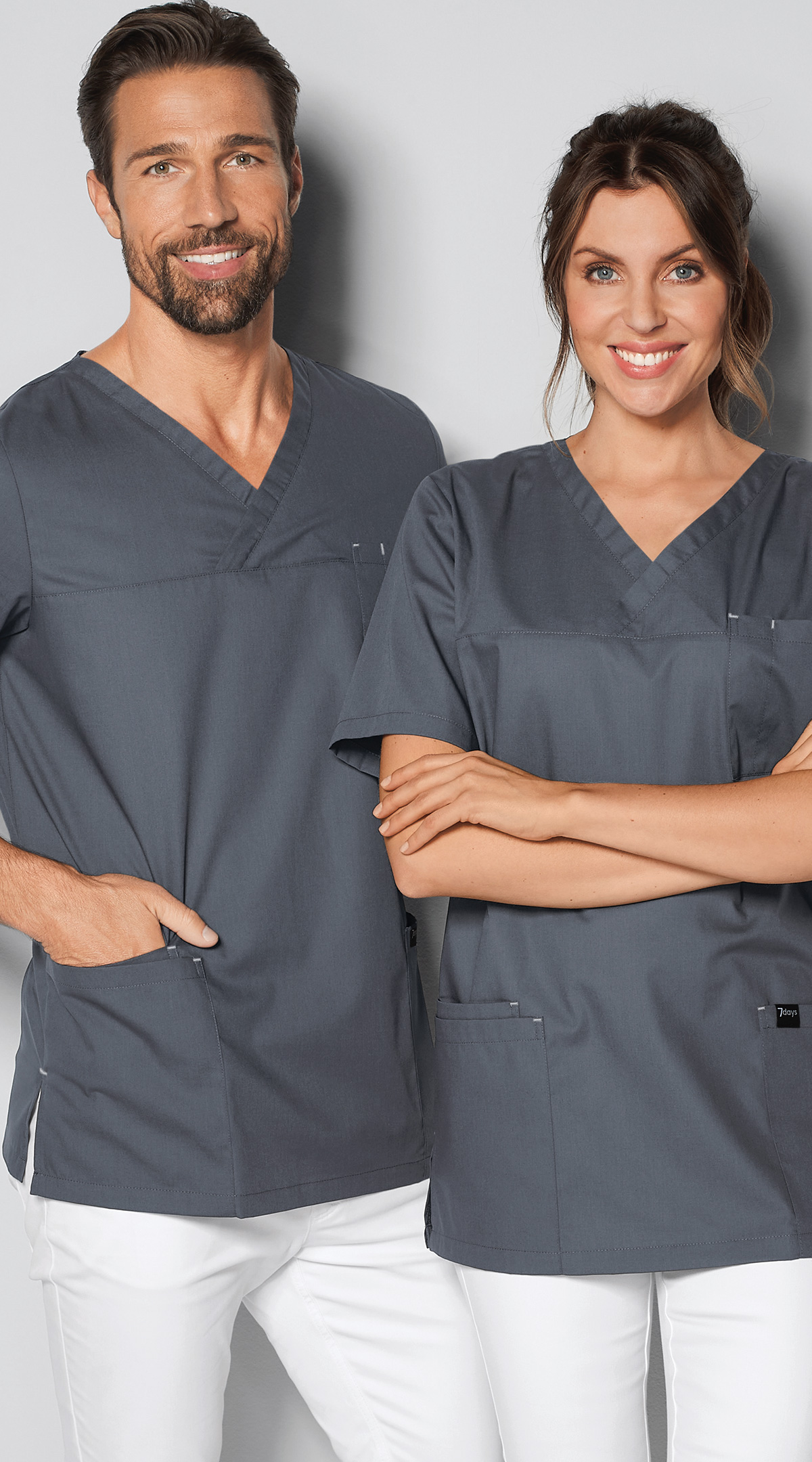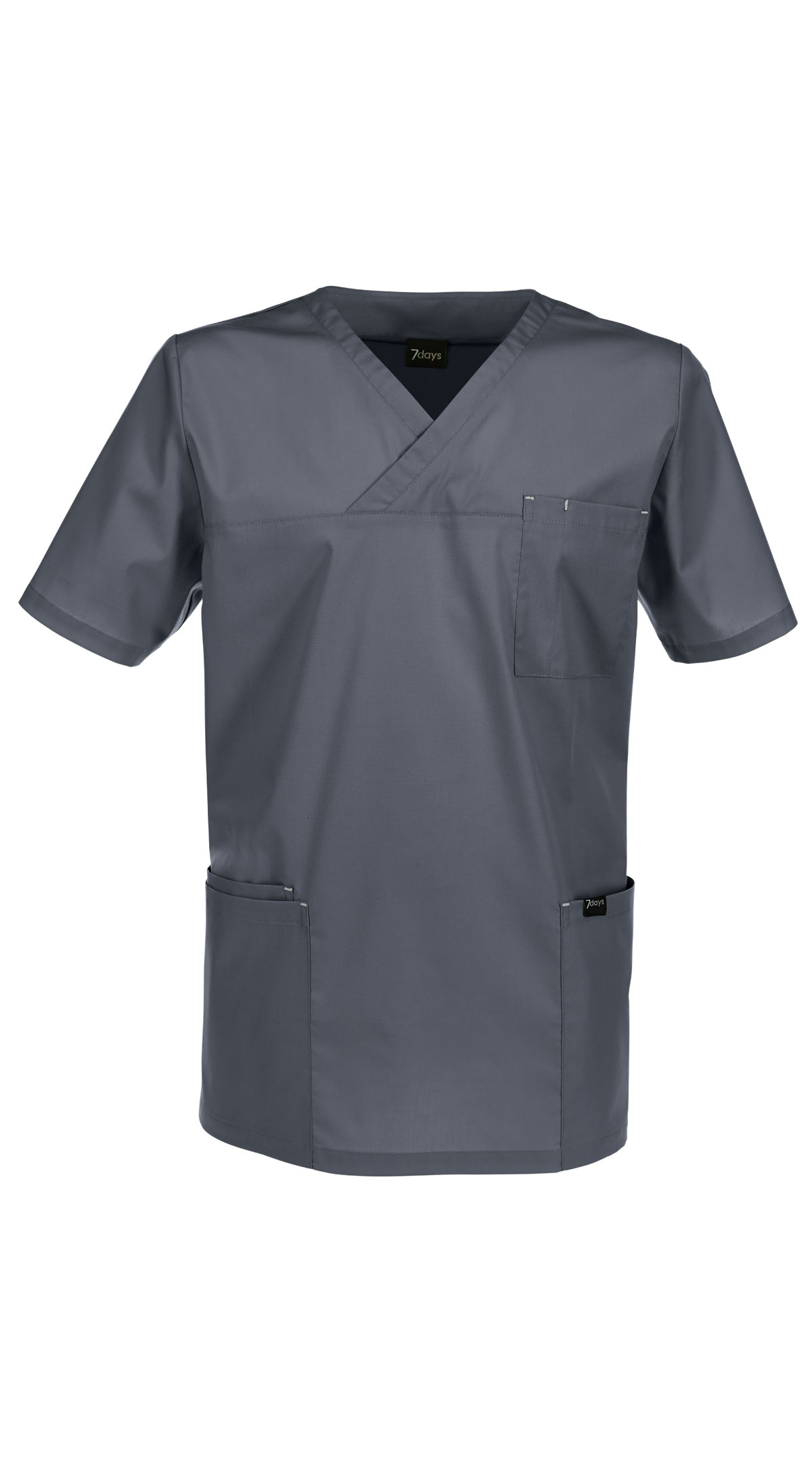 Stretchkasack, der jede Bewegung mitmacht. V-Ausschnitt, ½-Ärmel, 2 große Taschen + 1 kleine Tasche + 1 Brusttasche, lässig geschnitten, Seitenschlitze, Rückenlänge Gr. M ca. 74 cm. Weiß = 64% Polyester/33% Baumwolle/3% Elastolefin, 200 g/m2, Farben = 48% Polyester/49% Baumwolle/3% Elasthan, 150 g/m2, leichte Stretchware, 60°-Wäsche.
