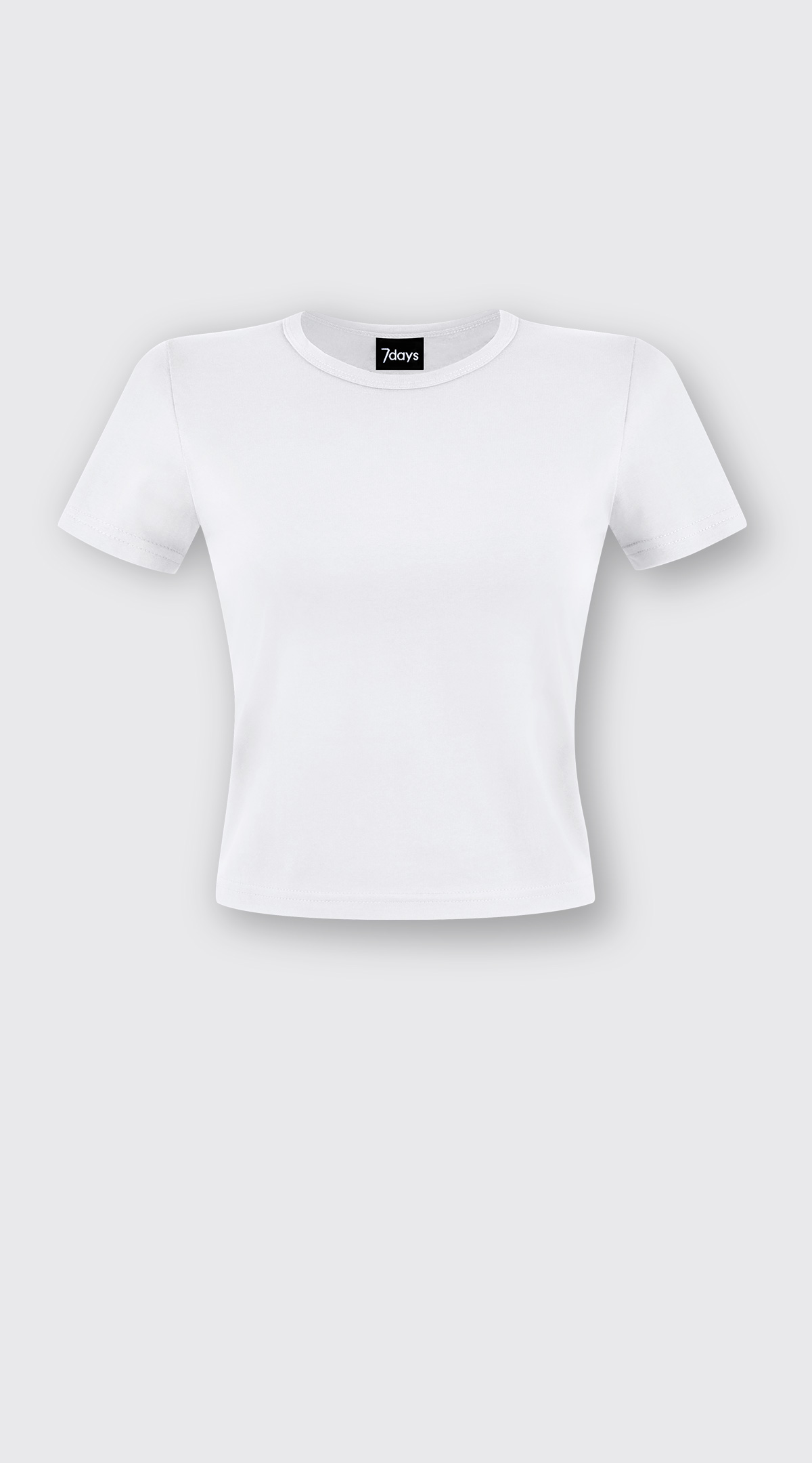Damenshirt, extra kurz geschnitten, perfekter Begleiter zur High-Waist-Jeans. Rundhalsausschnitt, Kurzarm, slim fit, Rückenlänge Gr. S ca. 47 cm. 95% Baumwolle/5% Elasthan, Single Jersey, 180 g/m2, 40°-Wäsche.