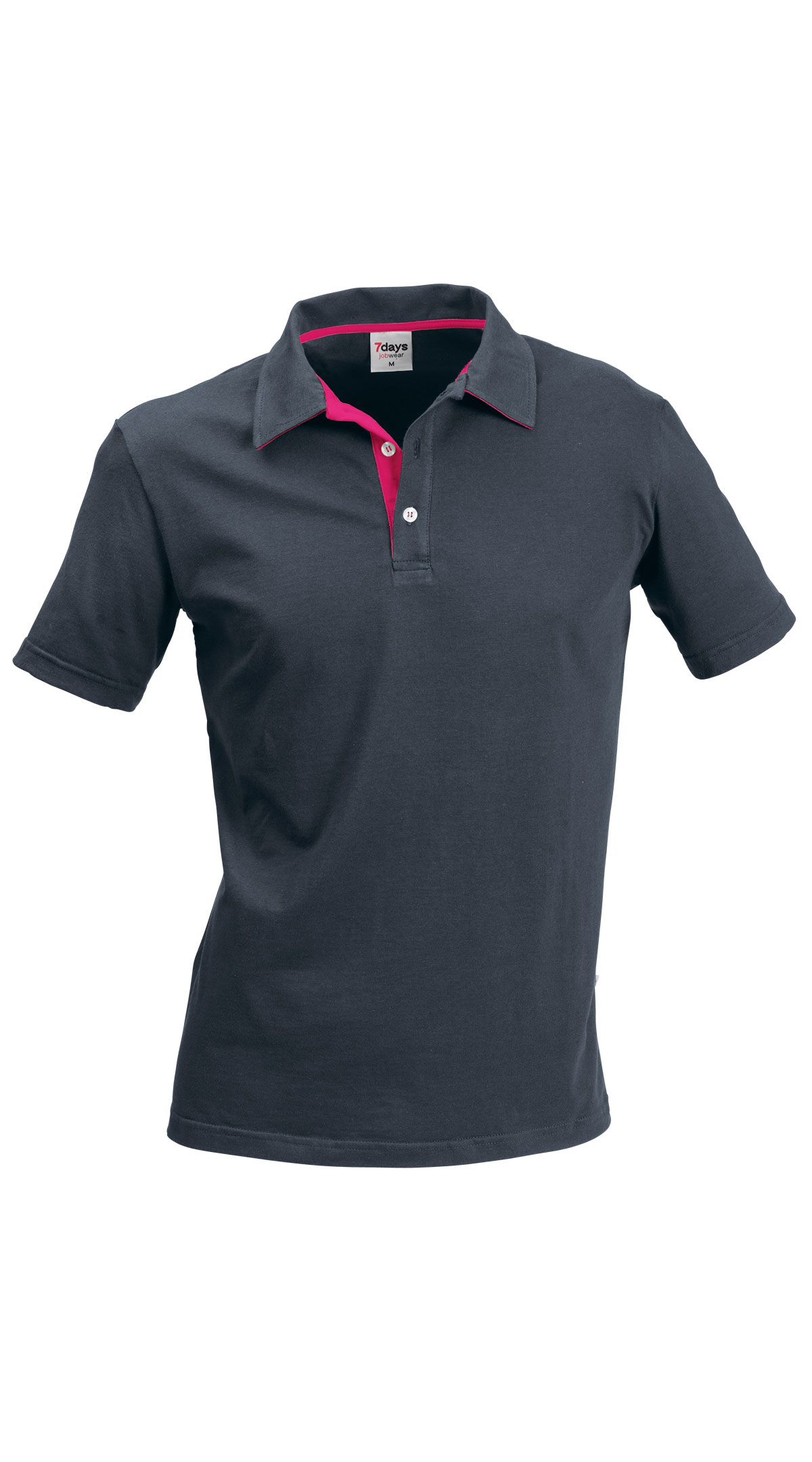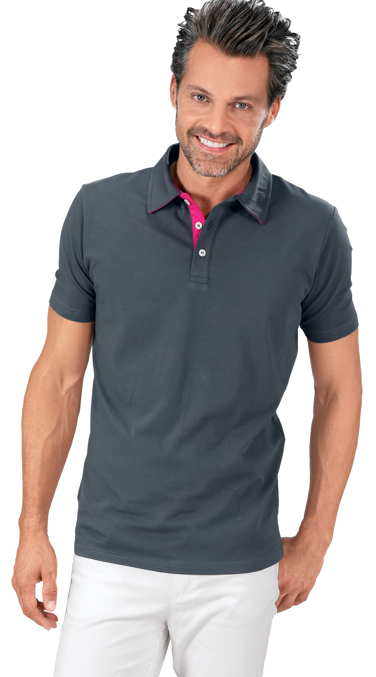Polokragen mit kurzer Knopfleiste und kontrastfarbener Innenseite, lässig geschnitten, ¼-Arm, Seitenschlitze, Rückenlänge Gr. M ca. 71 cm. Formstabile und elastische Qualität aus 95% Baumwolle/5% Elasthan, 180 g/m2, Single Jersey, 40°-Wäsche.