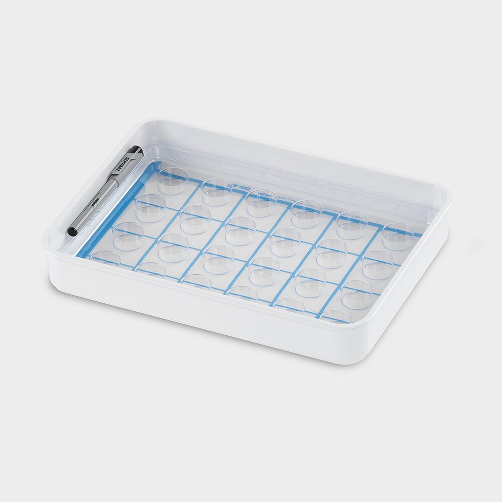 mit Tablett-Einsatz für 24 Becher Tabletten oder Tropfen mit Beschriftungsfolie und Folienstift Maße: L 353 x B 253 x H 55 mm