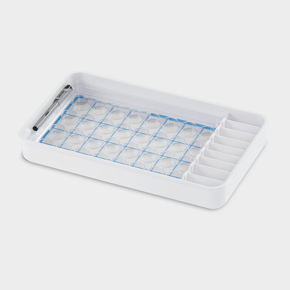 mit Tablett-Einsatz für 32 Becher Tabletten oder Tropfen und Pulver-Tütchen mit Beschriftungsfolie verschiebbarem Teilersystem und Folienstift Maße: L 433 x B 253 x H 55 mm