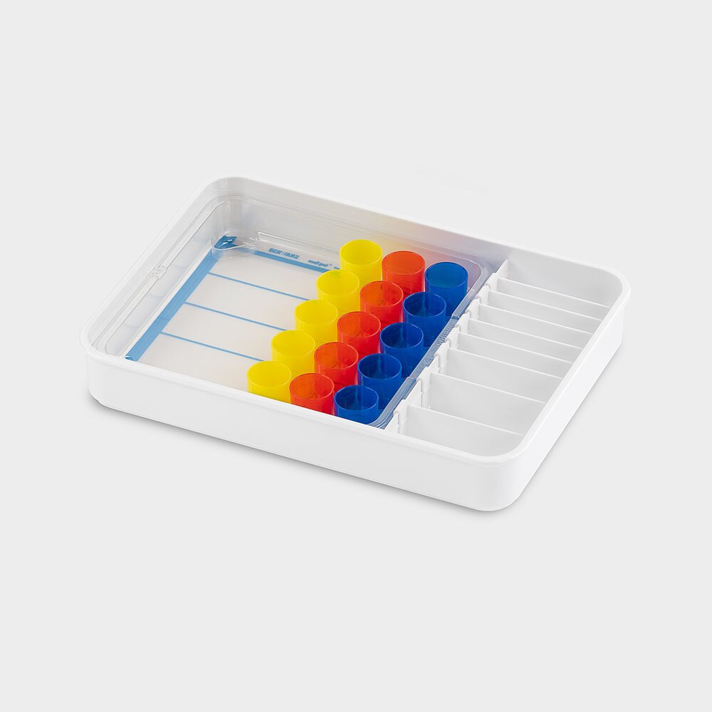 Mit variablen Fächern für Tropfen und Pulver-Tütchen Tabletteinsatz Beschriftungsfolie verschiebbarem Teilersystem Folienstift und 15 Mehrweg-Medikamentenbecher. Maße: L 353 x B 253 x H 55 mm